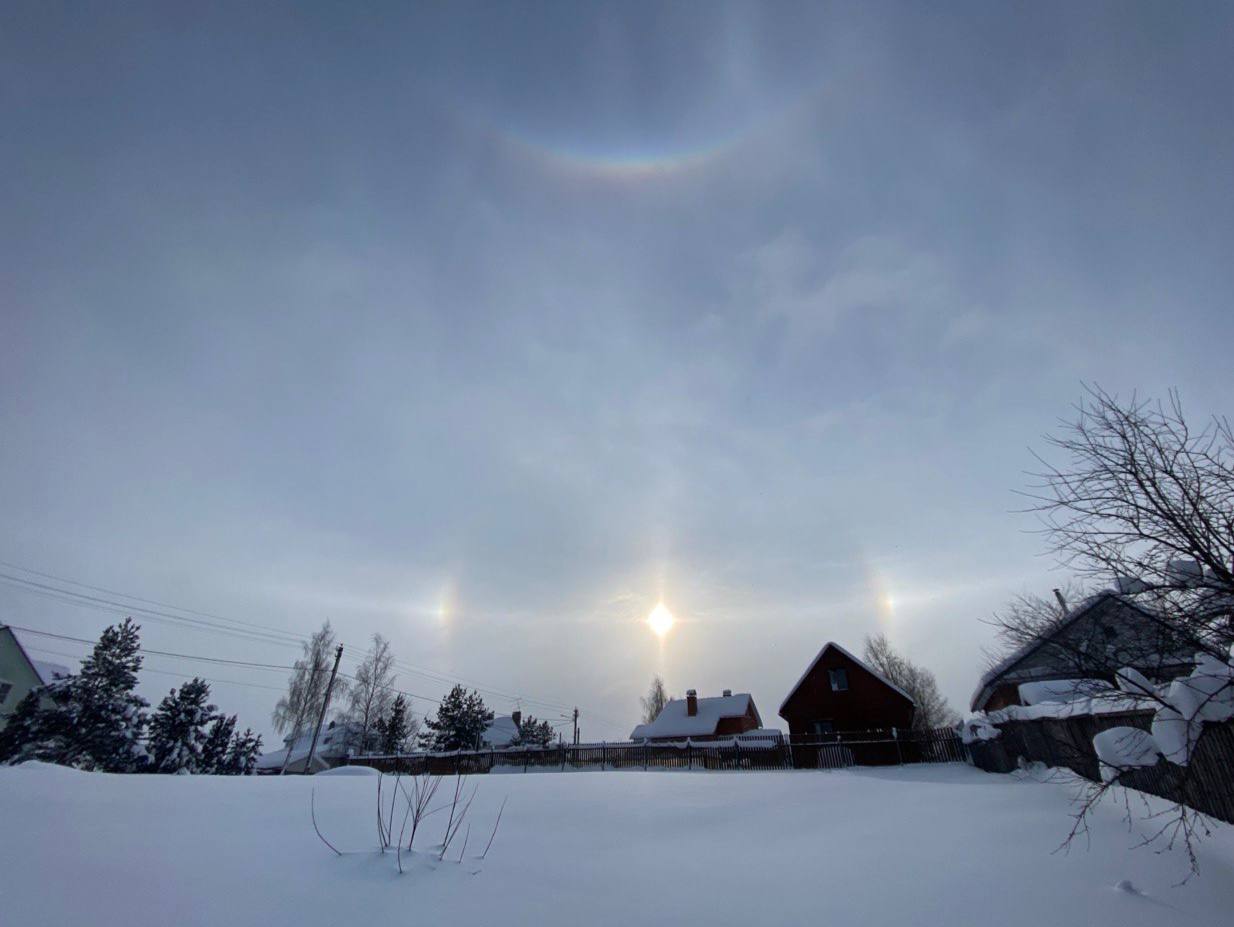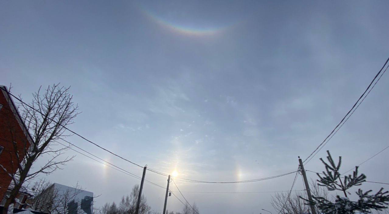 Паргелий в Подмосковье. Эффект трёх солнц. А тут ещё и сверху дуга радужная