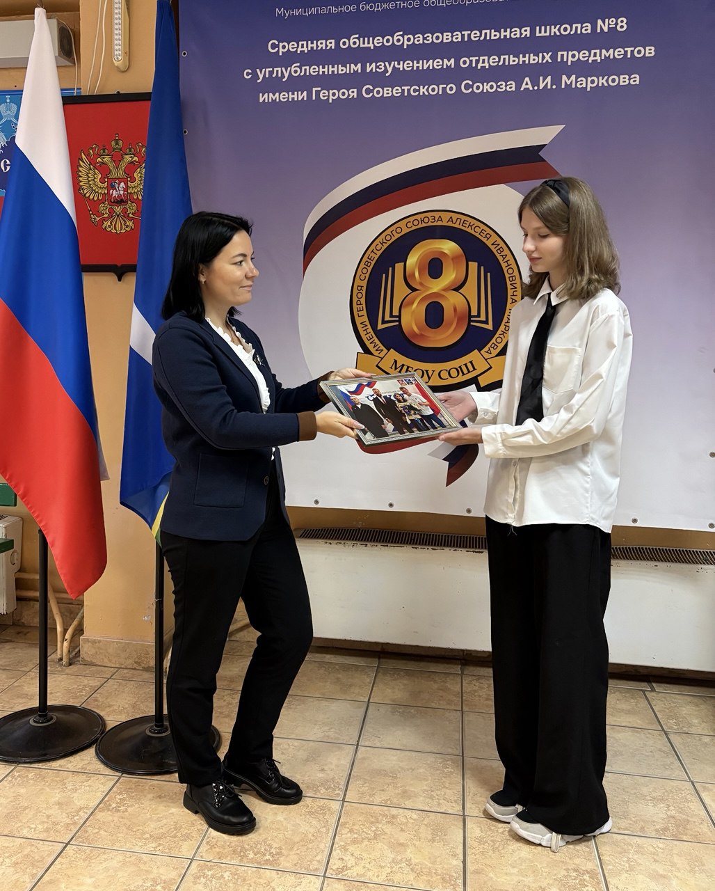 Сегодня директором школы МБОУ СОШ №8 Михайловой У.А. Еве была передана памятная фотография с этого значимого события.