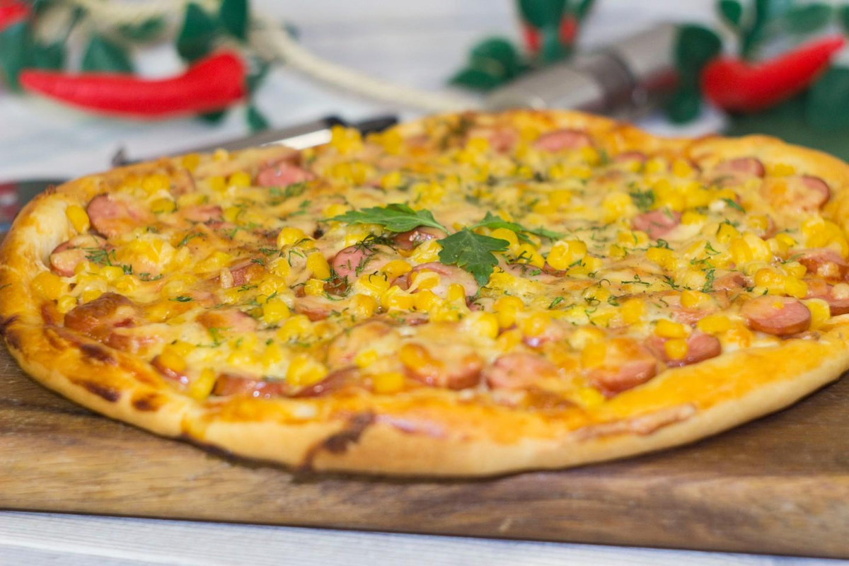 Приготовление этой пиццы не требует никаких сложных манипуляций. В первую очередь раскатать тесто на присыпанной мукой поверхности. Затем поместить его в смазанную оливковым маслом форму и равномерно распределить томатный соус. Следующий шаг — распределение натертого сыра по соусу, а потом нарезанной колбасы, которую следует выложить по всему диаметру пиццы. Не забудьте добавить кукурузу, лук и приправы, чтобы усилить аромат.