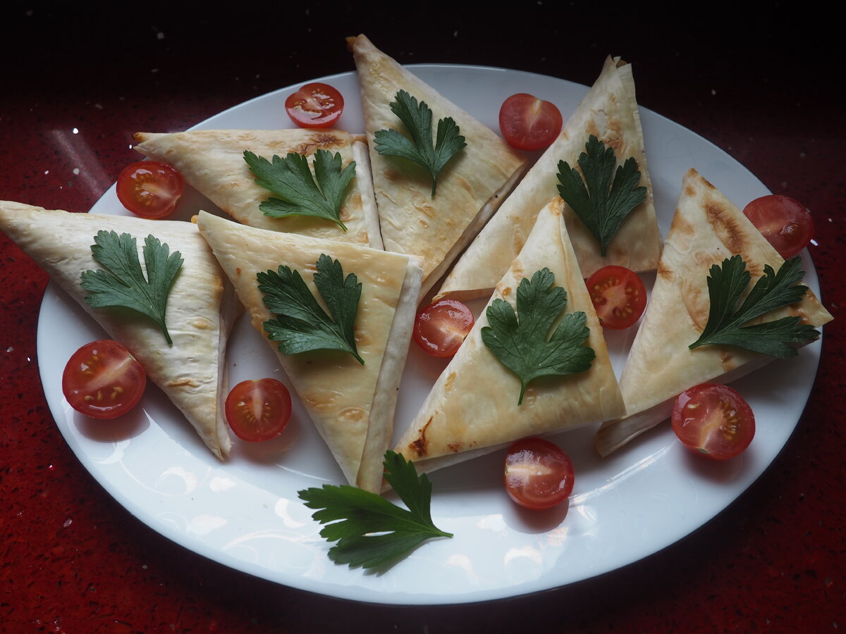 Далее, предварительно разрезав лаваш на полоски, на каждую из них выкладывается полная ложка начинки. Заворачивать нужно в аккуратный треугольник. Если хотите, можно смазать конвертики молоком или яйцом для дополнительного цвета и аппетитности.