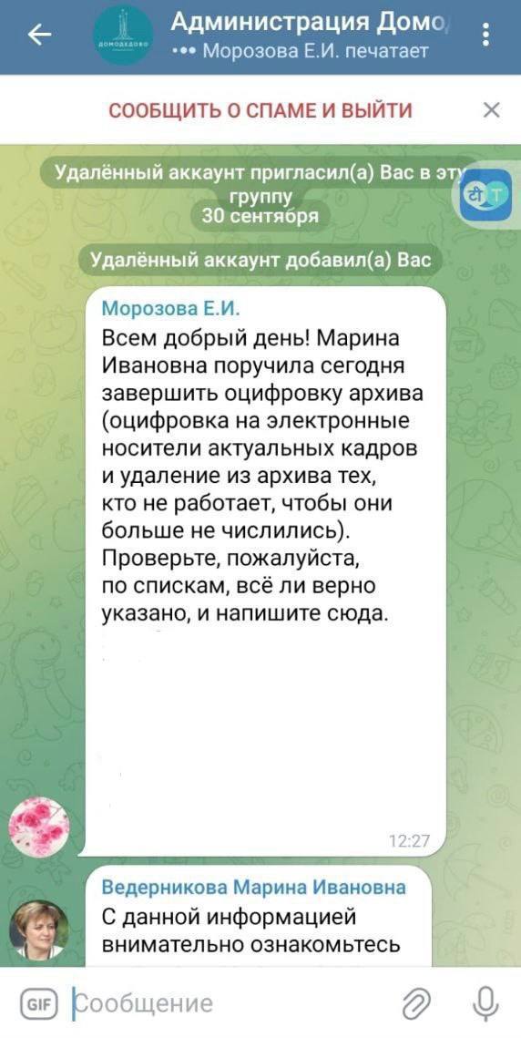 В группе написано, что якобы первый заместитель главы Марина Ведерникова поручила сегодня завершить оцифровку архива администрации. В группу добавляют не только сотрудников администрации, но и жителей Домодедово. НЕ ВЕДИТЕСЬ!