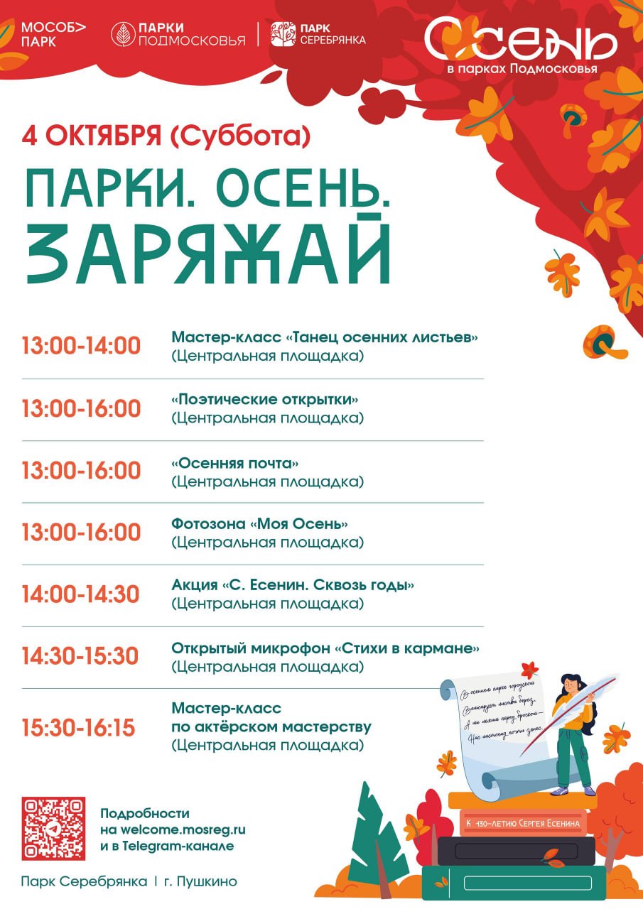 Дорогие жители, парки приглашают предстоящий субботний день в окружении золотых деревьев, свежего воздуха и вдохновляющей музыки осени.