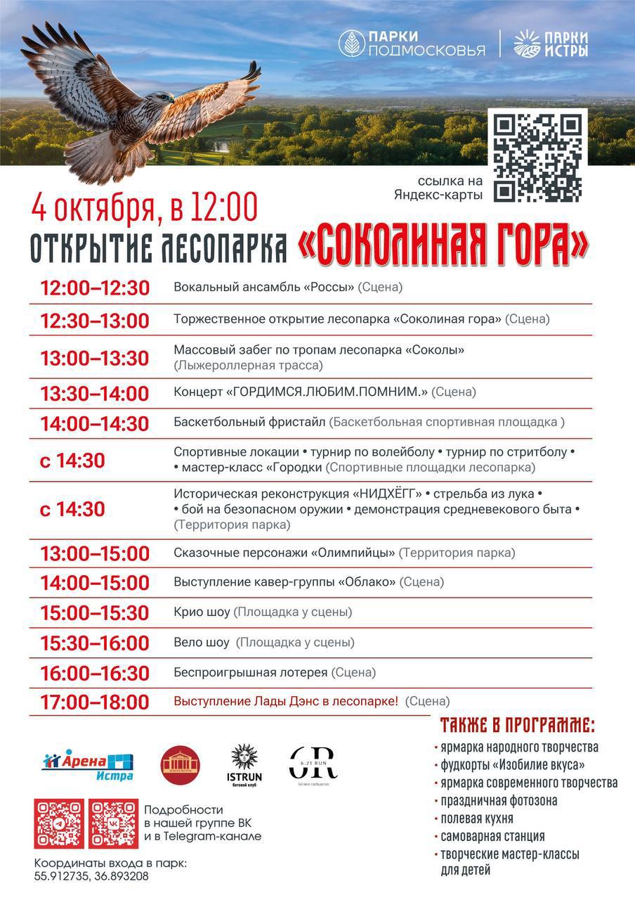 В эту субботу, 4 октября, жителей и гостей муниципального округа Истра ждёт долгожданное событие - открытие нового, стильного и современного общественного пространства, лесопарка «Соколиная гора»!