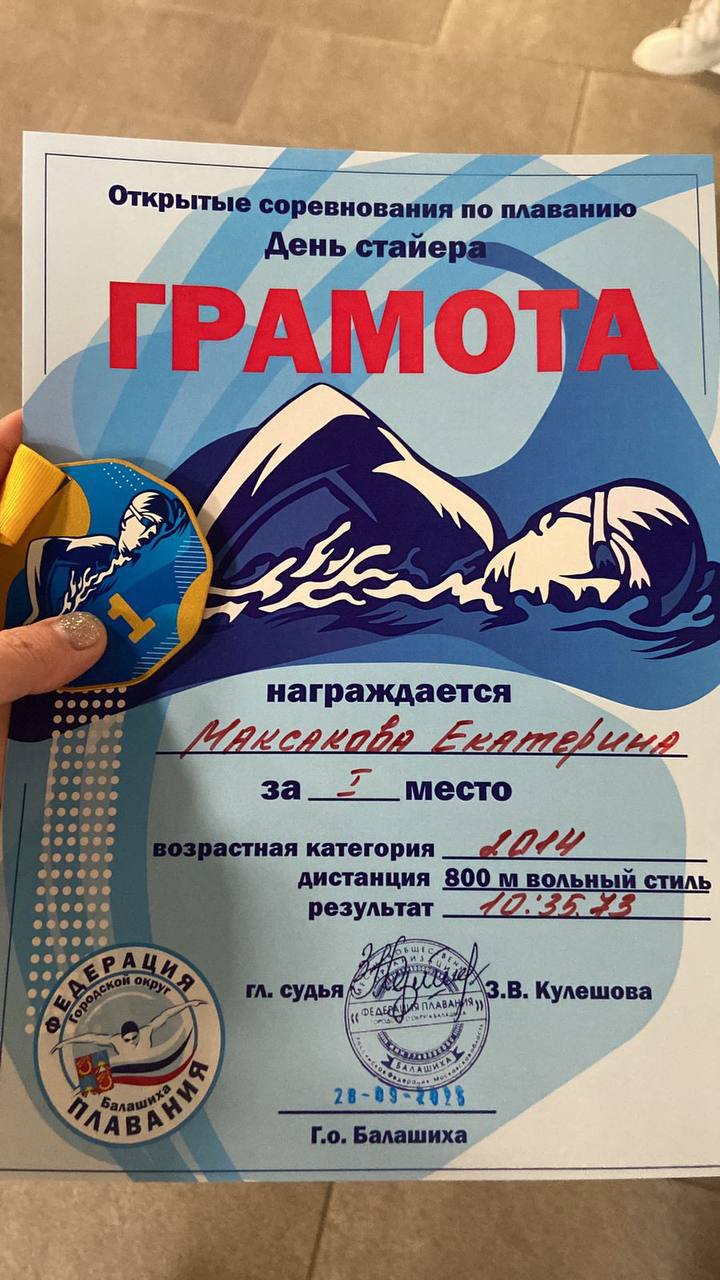 28 сентября на дистанции 800 м вольным стилем Екатерина Максакова из Чехова показала потрясающий результат — 10:35.73, что позволило ей занять первое место среди девушек 2014 года рождения!