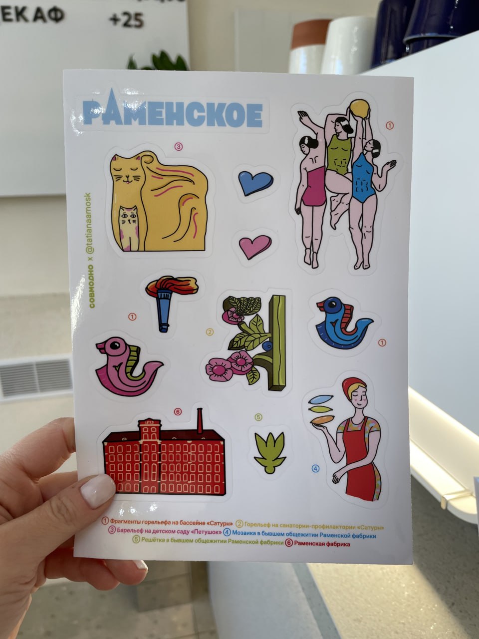 На них изображены бумагопрядильная фабрика, горельефы с пловцами со стены бассейна «Сатурн», мозаики и барельефы, которые украшают разные здания города. Стикеры можно наклеить на мобильный телефон, планшет, ноутбук или записную книжку, что станет не просто украшением, но и поможет популяризировать Раменское как туристический город.