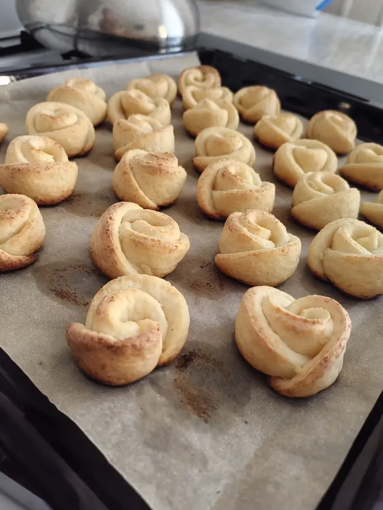 Соберите «розочки»: соедините три половинки вместе, сформировав красивый цветок. По вашему желанию, можно посыпать их сахаром или корицей для дополнительного вкуса. Выпекайте печенье в заранее разогретой духовке при 200 градусах в течение 15–20 минут, следя за тем, чтобы оно не подгорело и стало румяным.