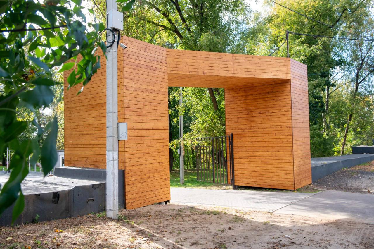 В Центральном городском парке Истры появился новый архитектурный акцент. Вместо громоздкой конструкции теплотрассы на входе со стороны улицы Советская теперь гостей встречает аккуратная входная группа.