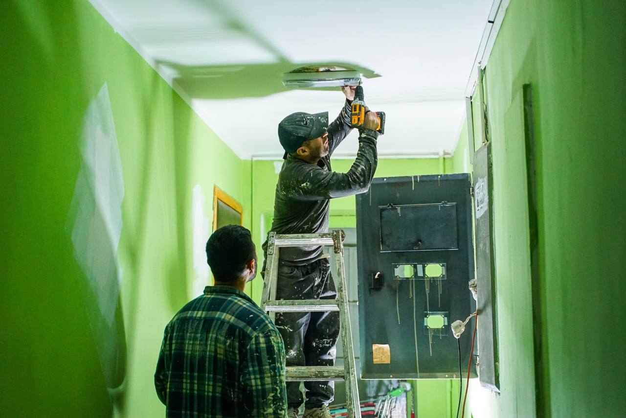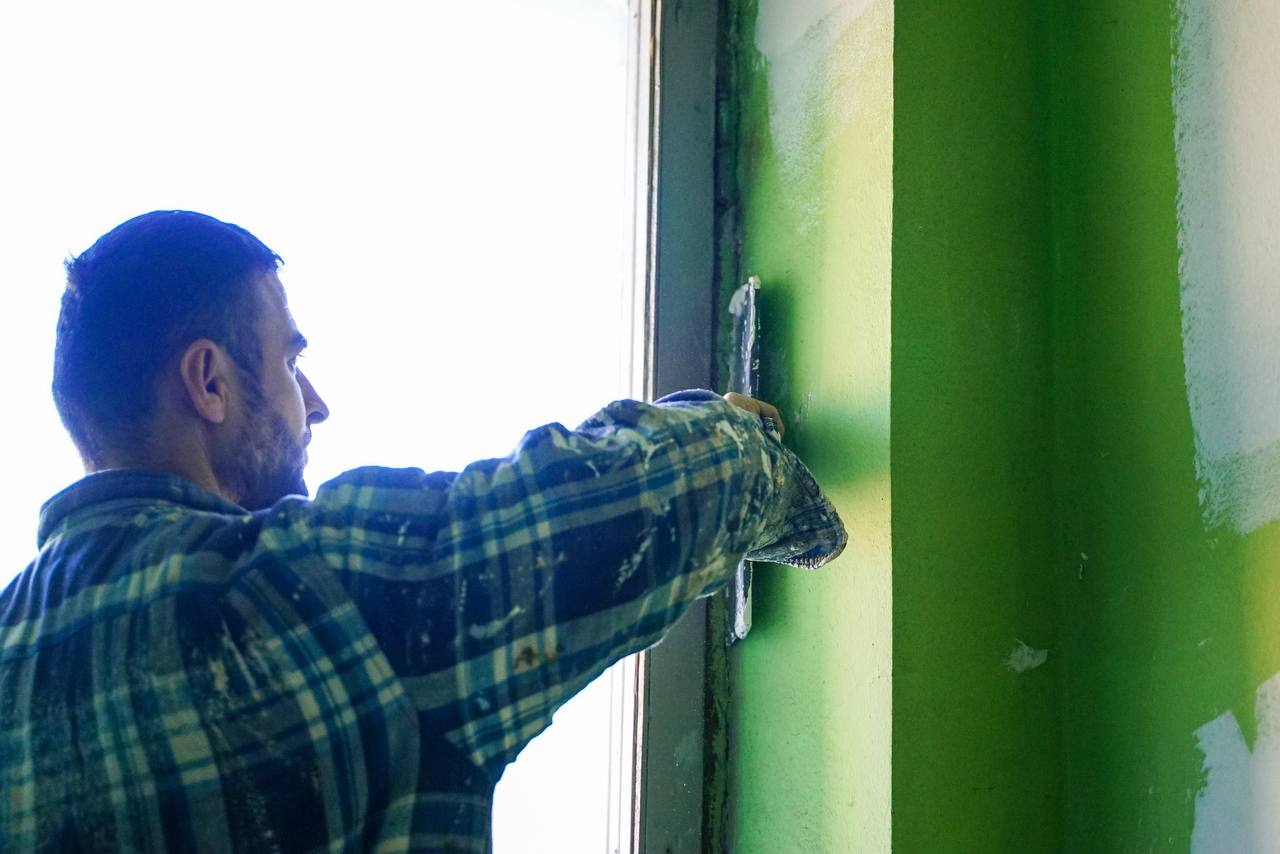 Рабочие уже провели грунтовочные работы, покрасили потолки и стены, а также заменили окна и светильники, установили новые входные и тамбурные двери. Финальным этапом ремонта станет замена двери, которая ведёт на пожарную лестницу.