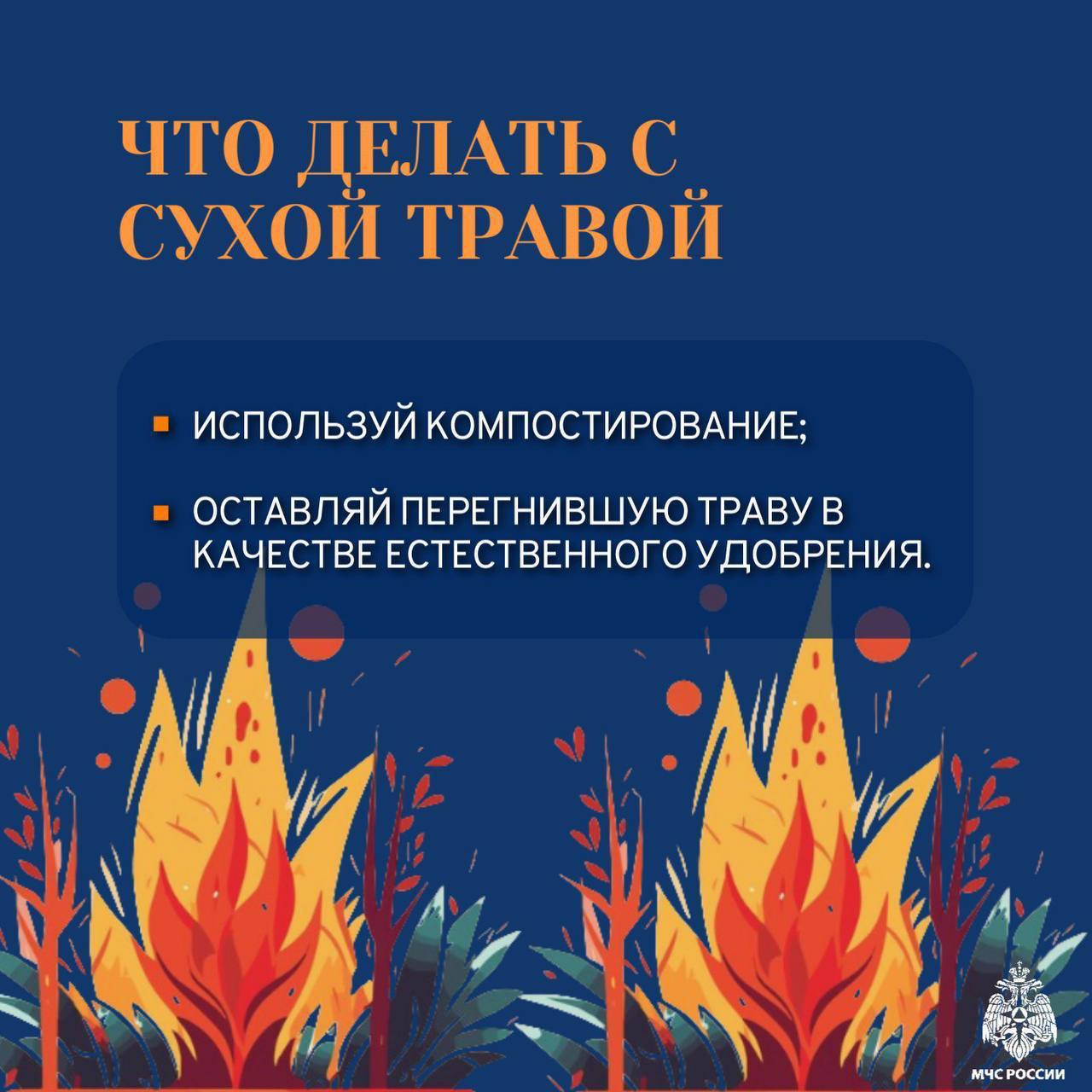 Соблюдай правила пожарной безопасности, не сжигай сухую траву. Читай и делись памятками МЧС России.