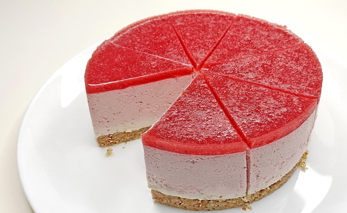 Смешайте оставшуюся клубнику с желатином и подсластителем. Вылейте массу на припухший чизкейк и отправьте в холодильник минимум на 4 часа для окончательного застывания.