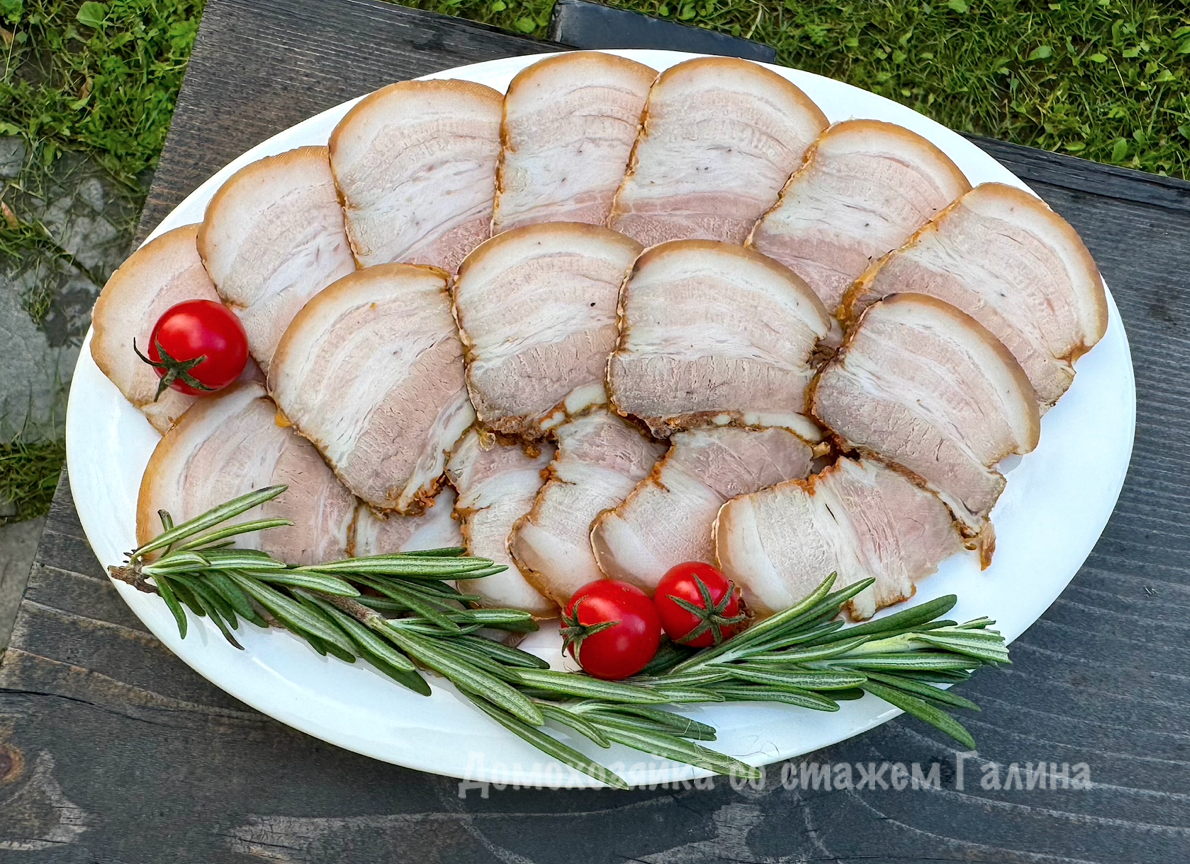 Готовую грудинку нарежьте тонкими ломтиками и красиво выложите на сервировочное блюдо. Это блюдо прекрасно подается как горячим, так и холодным.