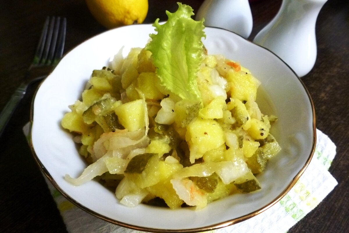 Соленые огурцы то же нарезать кубиками и добавить к картофелю вместе с квашеной капустой. Мелко нарезанный лук придаст блюду дополнительный аромат и свежесть. Не забудьте приправить всё смесью перца и соли — например, если капуста имеет ярко выраженный кислый вкус, лучше добавить небольшую щепотку сахара, чтобы сбалансировать оттенки.