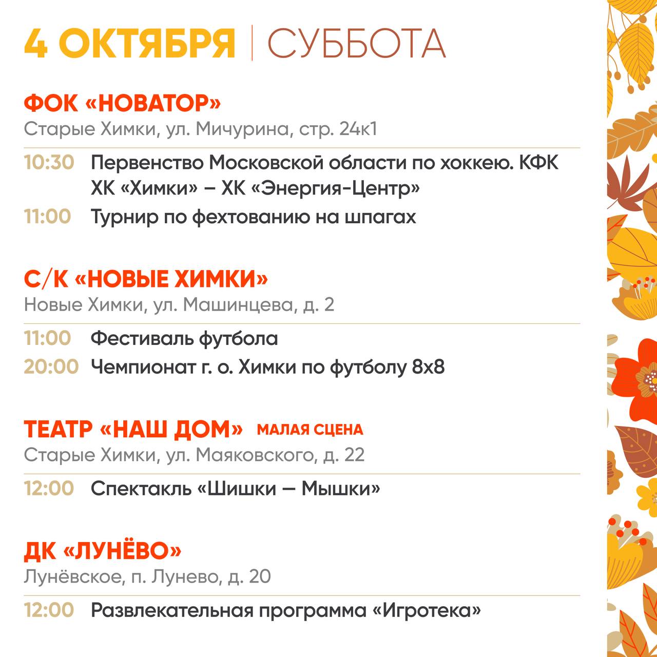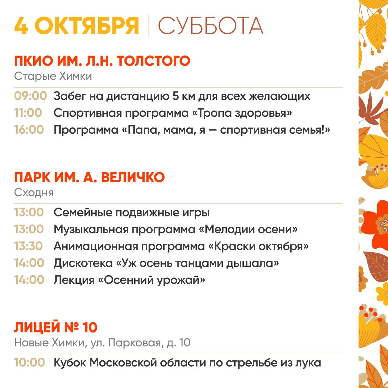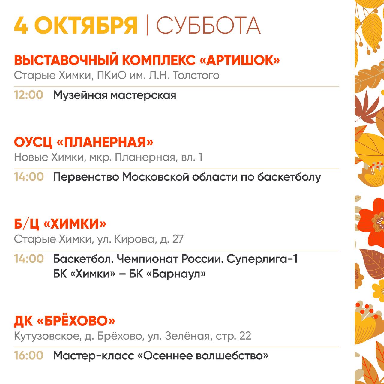 СУББОТА (4 октября)12:00-12:40 Игровая развлекательная программа для детей (0+)12:40-13:10 Мастерская в парке (6+)13:00-15:00 Фестиваль. ПАРКИ.ОСЕНЬ.ЗАРЯЖАЙ. (0+)ВОСКРЕСЕНЬЕ...