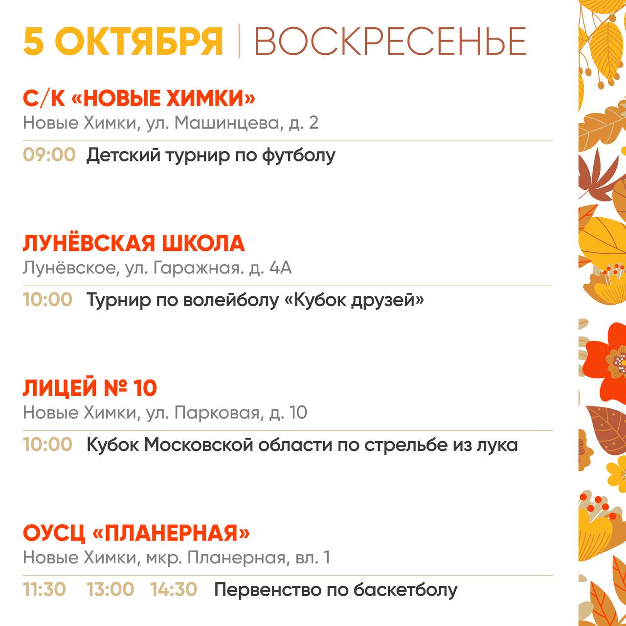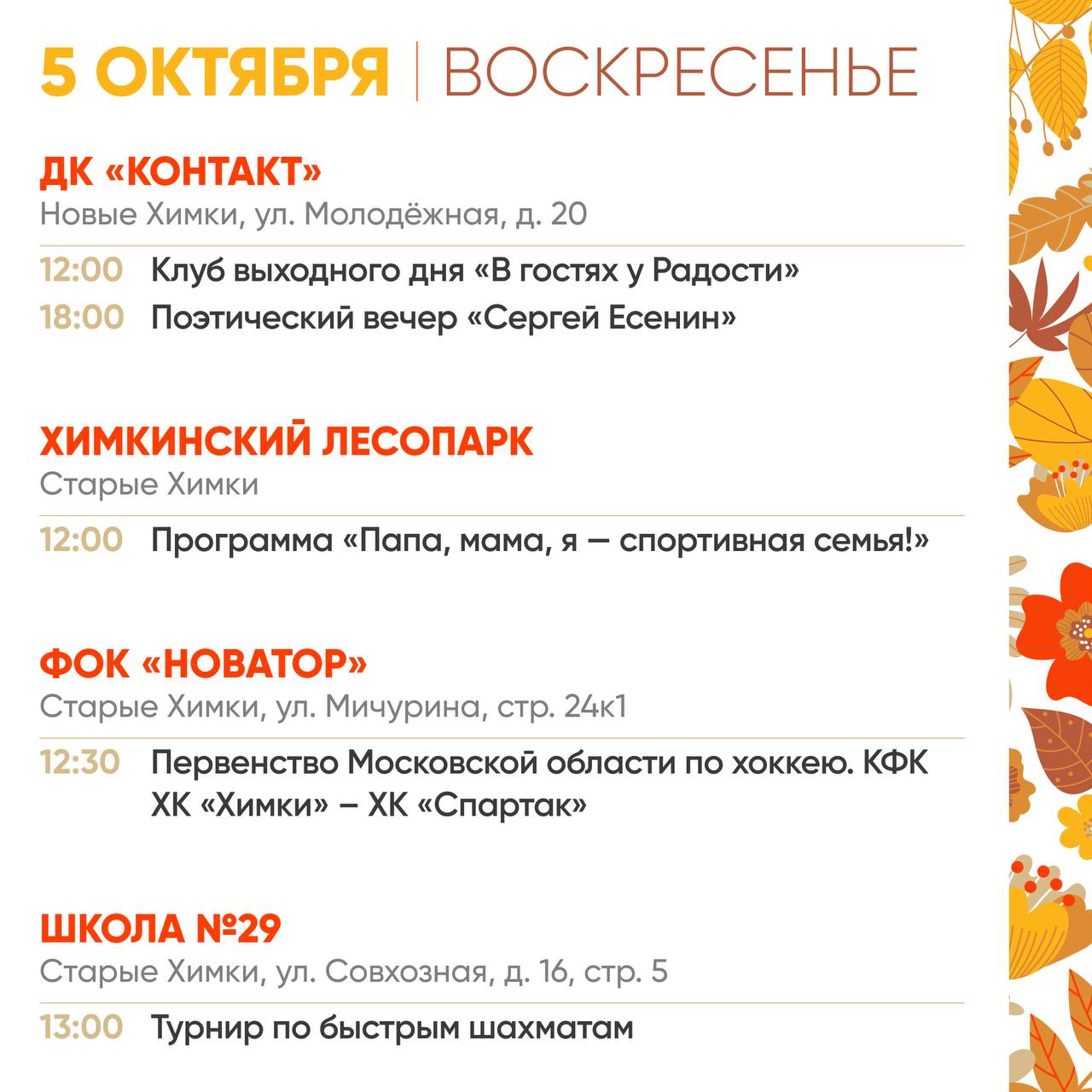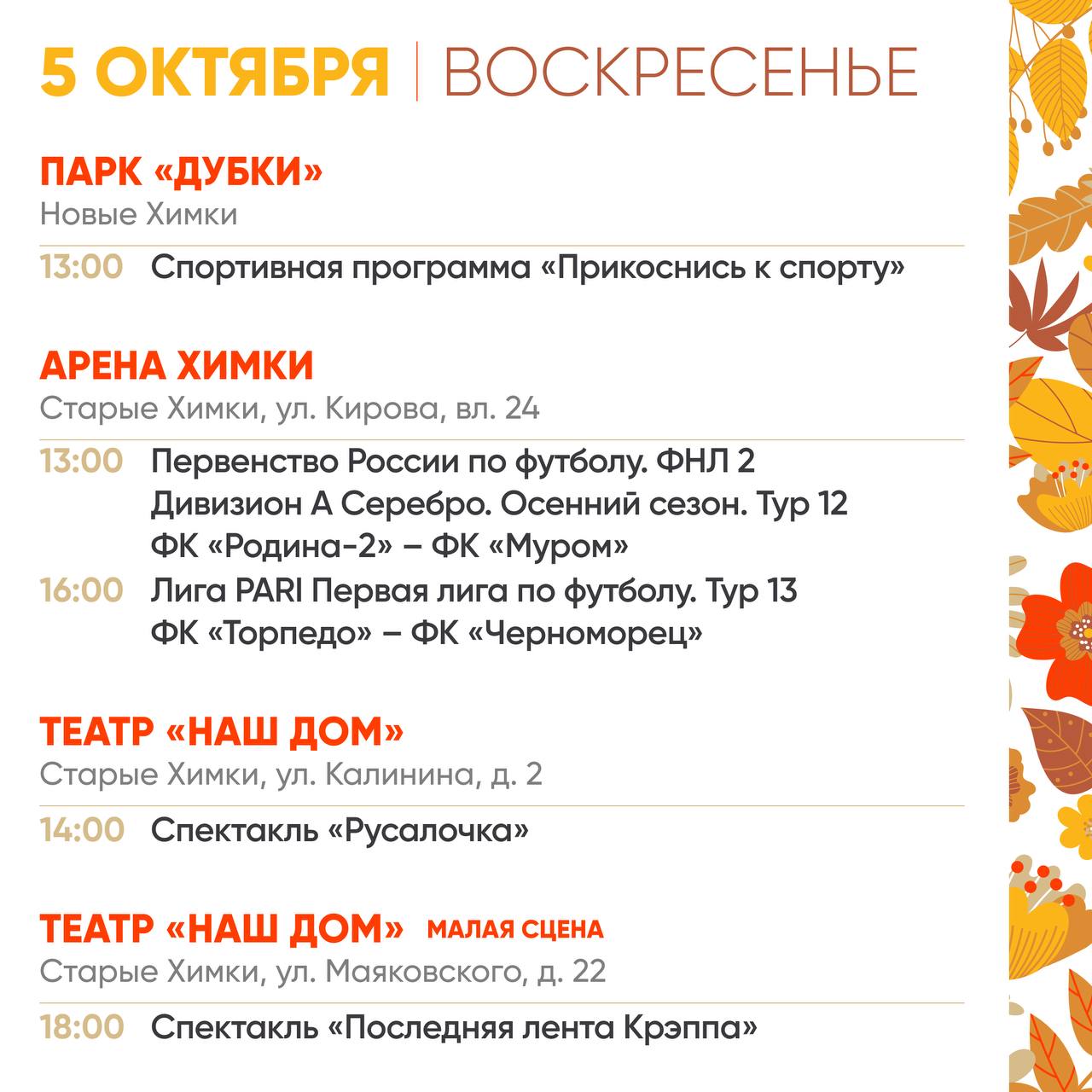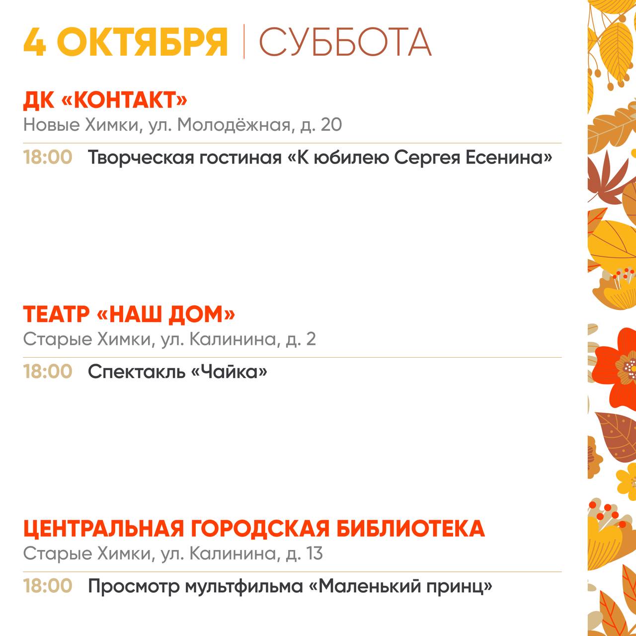 СУББОТА (4 октября)12:00-12:40 Игровая развлекательная программа для детей (0+)12:40-13:10 Мастерская в парке (6+)13:00-15:00 Фестиваль. ПАРКИ.ОСЕНЬ.ЗАРЯЖАЙ. (0+)ВОСКРЕСЕНЬЕ...