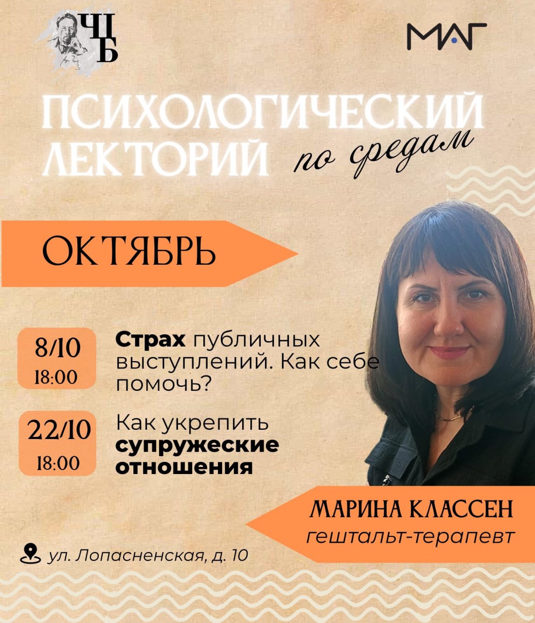 Центральная библиотека г. Чехова и Международная Академия Гештальта (г. Москва) приглашают вас на новые встречи в рамках нашего совместного проекта. Вас ждут актуальные темы, живое обсуждение и ответы на вопросы от опытного психолога.