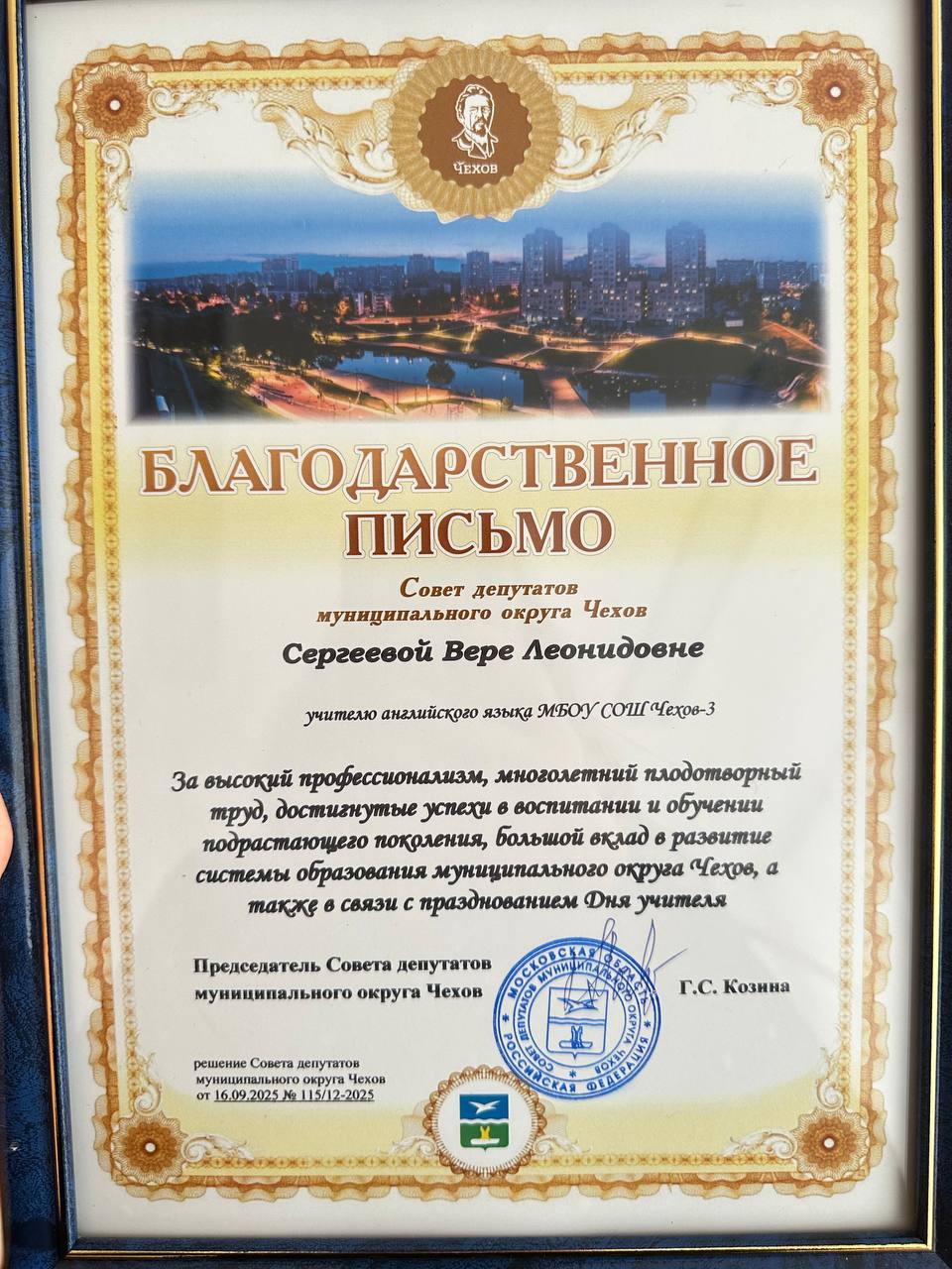 Благодарственным письмом Совета депутатов муниципального округа Чехов наградили учителя английского языка нашей школы Сергееву Веру Леонидовну.Поздравляем!