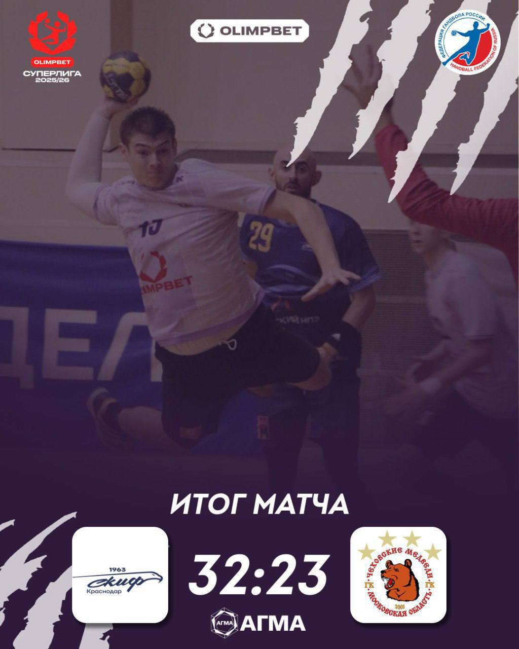 4 октября, «Чеховские медведи» провели матч OLIMBET Суперлиги в Краснодаре против СКИФа и потерпели поражение со счётом 23:32 (13:14).