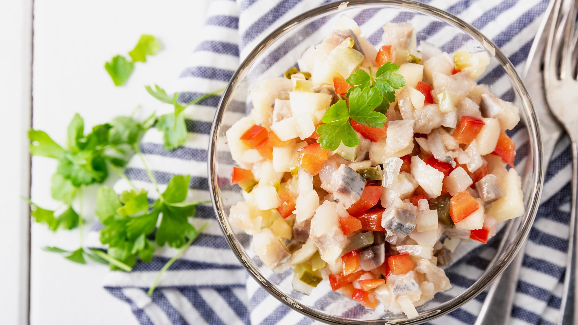 Обычно из селедки готовят «шубу», но летом такое блюдо может оказаться тяжеловатым. А винегрет многим уже порядком надоел. Разнообразить обеды и ужины поможет этот простой салат. Он идеально подойдет для пикников на даче и не только.