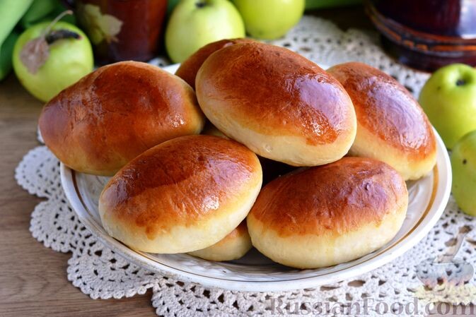 - Дрожжевые пирожки с яблоками: Мягкие, словно пух, они приготовлены из безопарного теста. Начинка из тушеных яблок с добавлением рома придаёт блюду особый аромат.