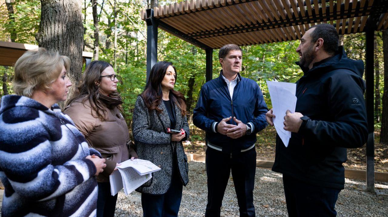 Также выполняются работы по устройству тропиночной сети протяжённостью более 6 км, укладке линий освещения, установке малых архитектурных форм — навесов-пергол и габионов.