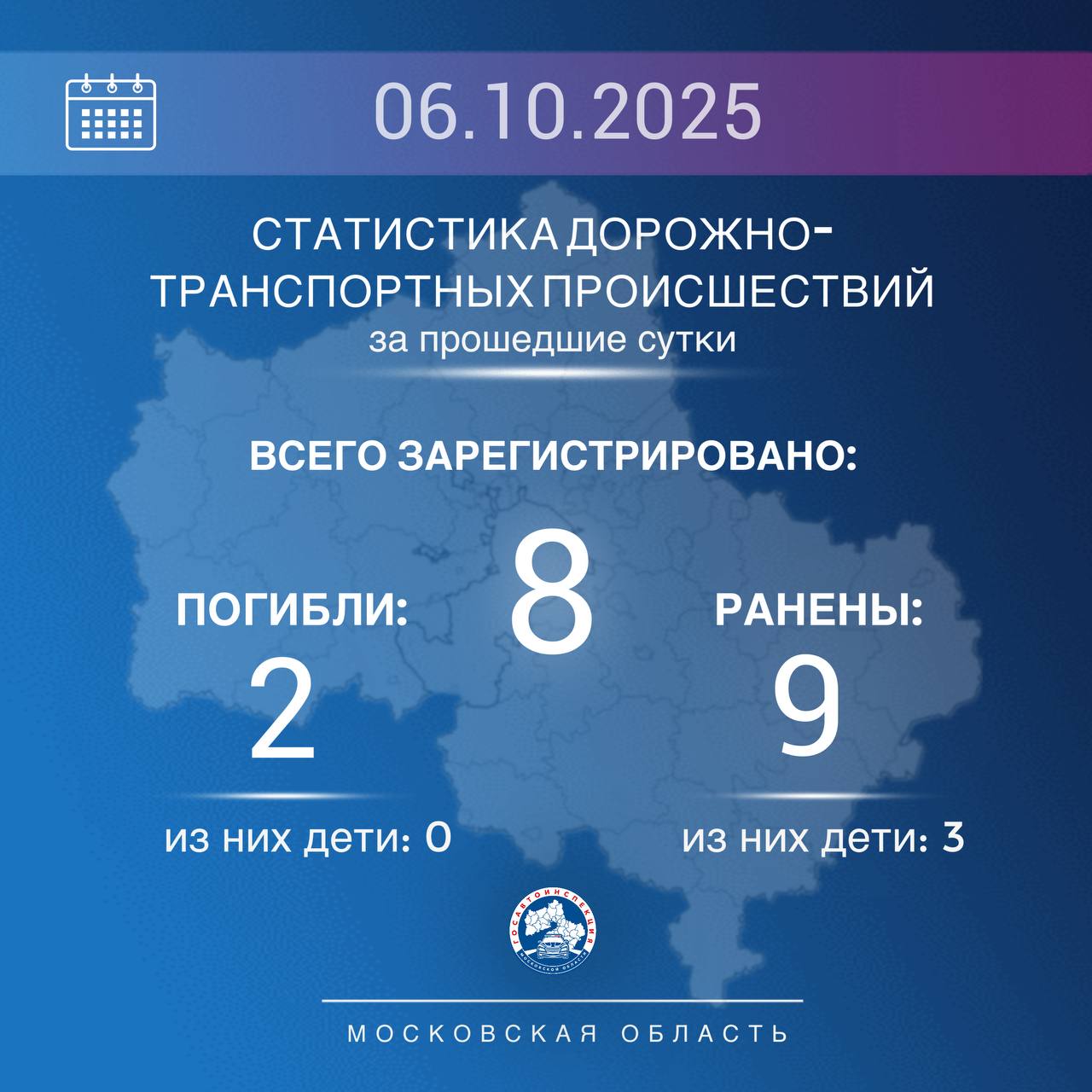 6 октября 2025 года на дорогах Подмосковья зарегистрировано 8 ДТП, в которых 2 человека погибли и 9 получили ранения различной степени тяжести.