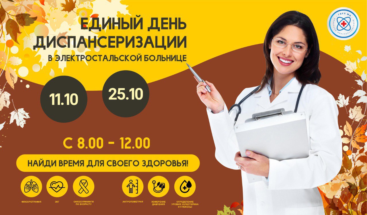 11 и 25 октября с 08:00 до 12:00 в Электростальской больнице (ул. Пушкина, 3) пройдет Единый день диспансеризации.