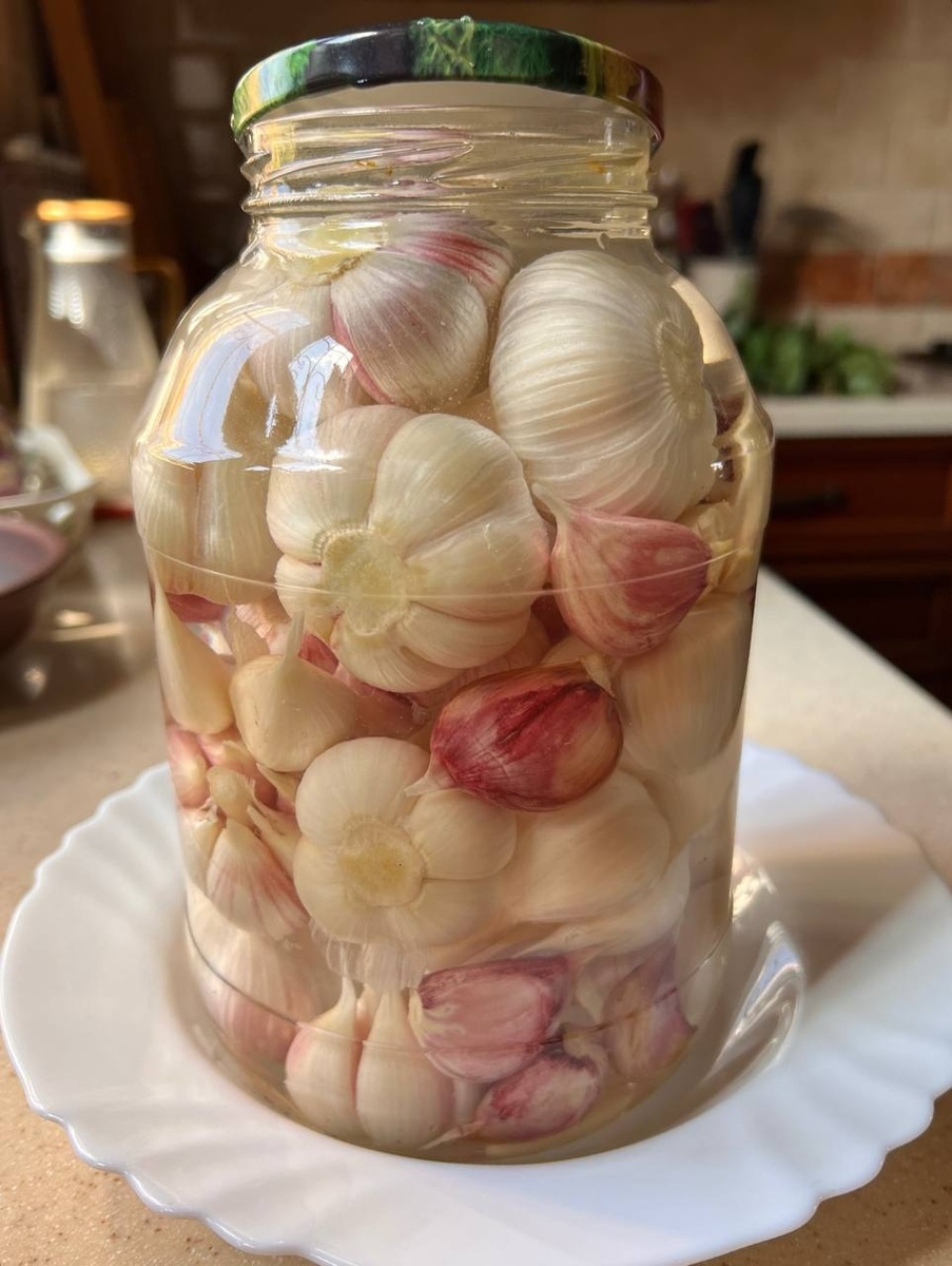 - Замачивание в воде: Чистый чеснок помещается в банку и заливается холодной водой. Воду следует менять дважды в день — утром и вечером. Спустя три дня чеснок необходимо промыть, а затем залить соляным раствором (50 граммов соли на литр воды) и убрать в холодильник на месяц.