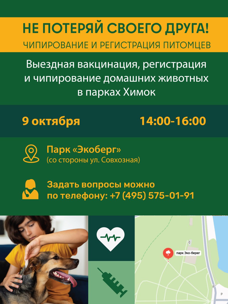 Мобильный пункт Госветслужбы будет ждать вас и ваших любимцев в парке со стороны ул. Совхозная (точные координаты: 55.900751, 37.472101). Специалисты будут работать с 14:00 до 16:00.