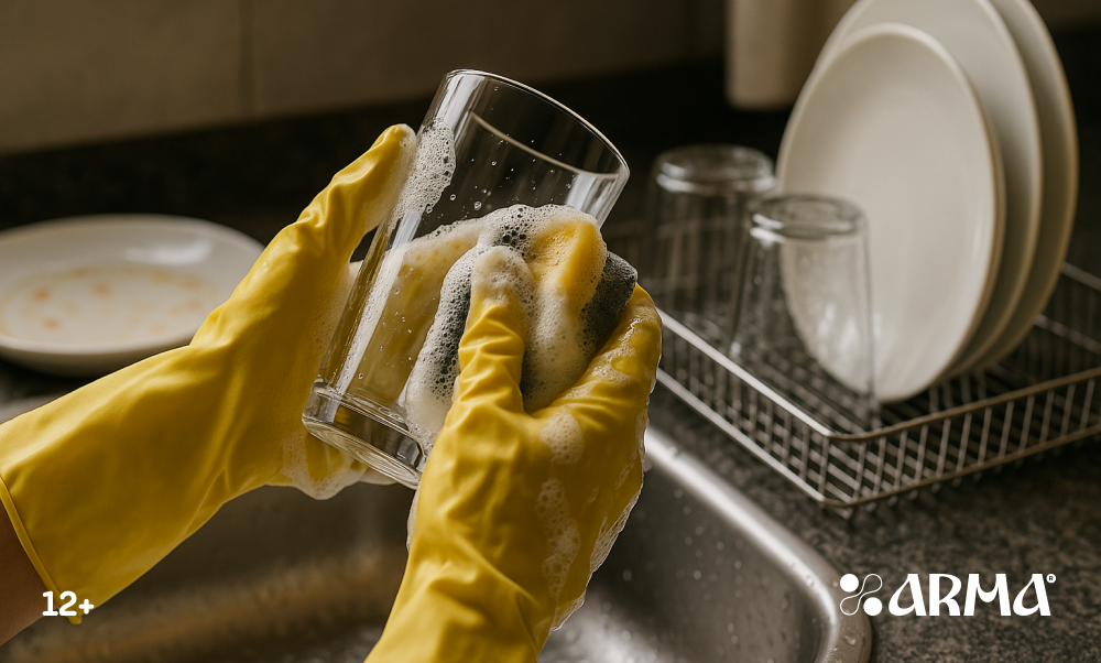 - Средство для мытья: Выбирайте безопасные моющие средства с ухаживающими компонентами. Отдайте предпочтение экологически чистым продуктам — они нежнее к вашим рукам и менее вредны для окружающей среды.