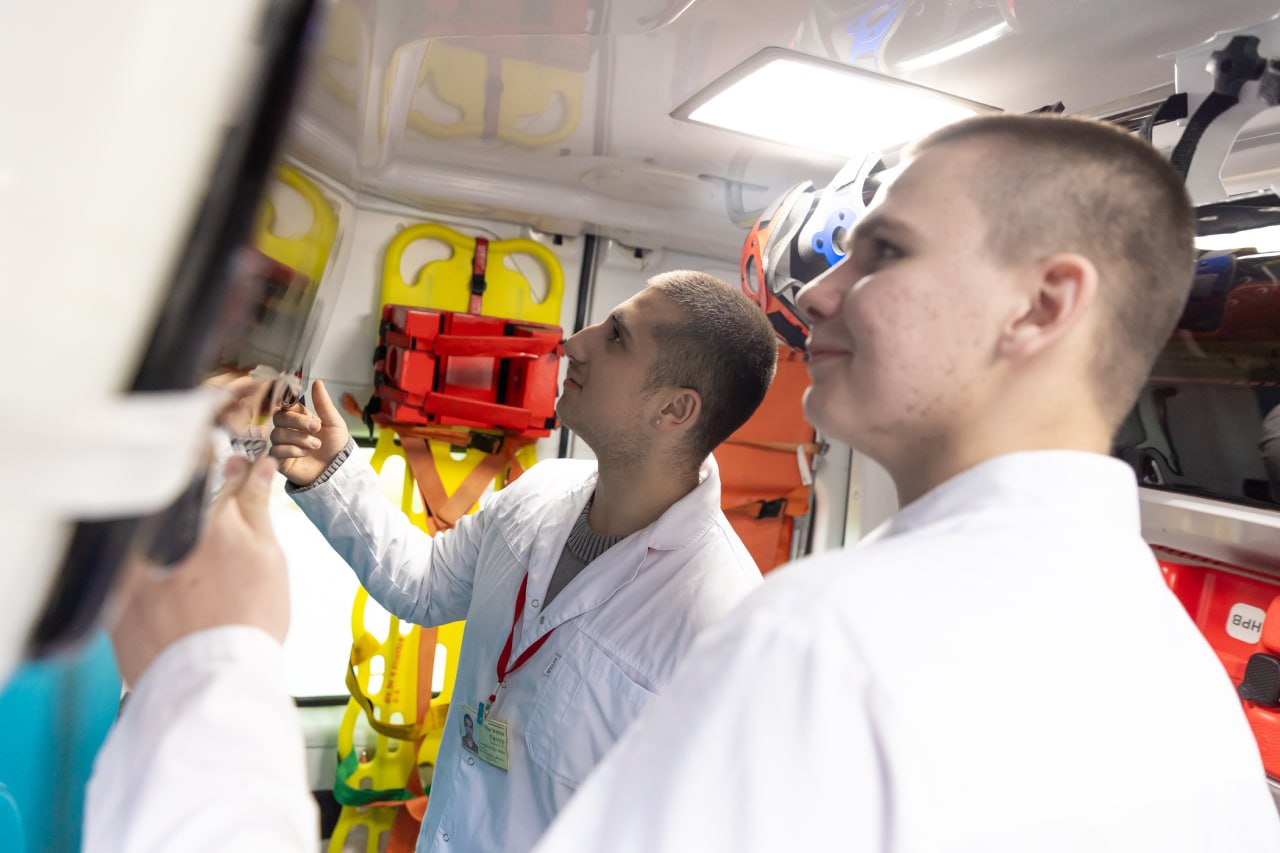 Будущие фельдшеры и медсестры буквально “погрузились” в атмосферу скорой помощи: заглянули внутрь машины, изучили оборудование и узнали, как работает техника, которая ежедневно помогает спасать жизни.