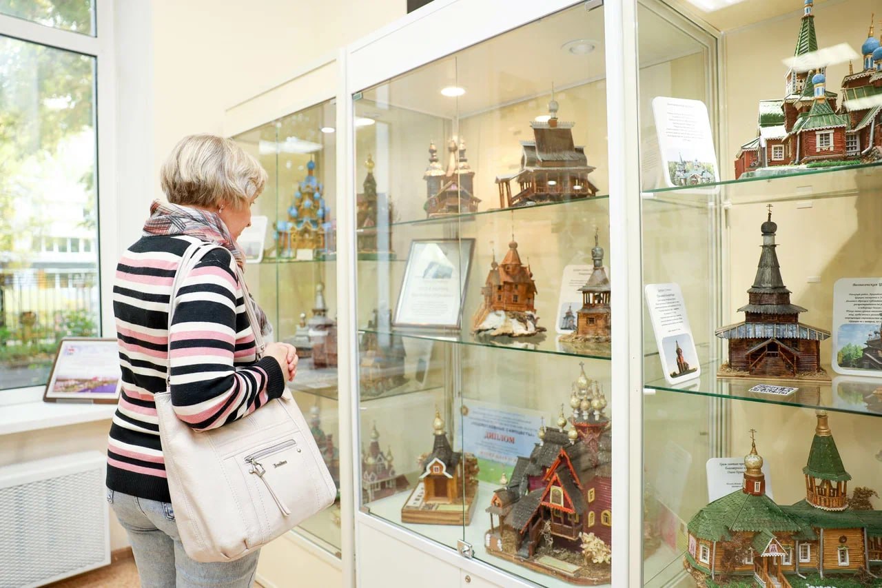 Многолетнюю выставку работ Владимира Гуральника, действующую в стенах этой библиотеки, можно по праву назвать единственным в России музеем деревянного зодчества в миниатюре. Здесь хранятся около 60 авторских работ нашего гениального земляка. Его миниатюры, сделанные с соблюдением всех пропорций оригинала, сохраняют для истории деревянные церкви, в том числе облик нескольких уже несуществующих старинных церквей. Среди его работ – миниатюрные копии деревянных храмов русского Севера, Карелии и, конечно, городского округа Мытищи.