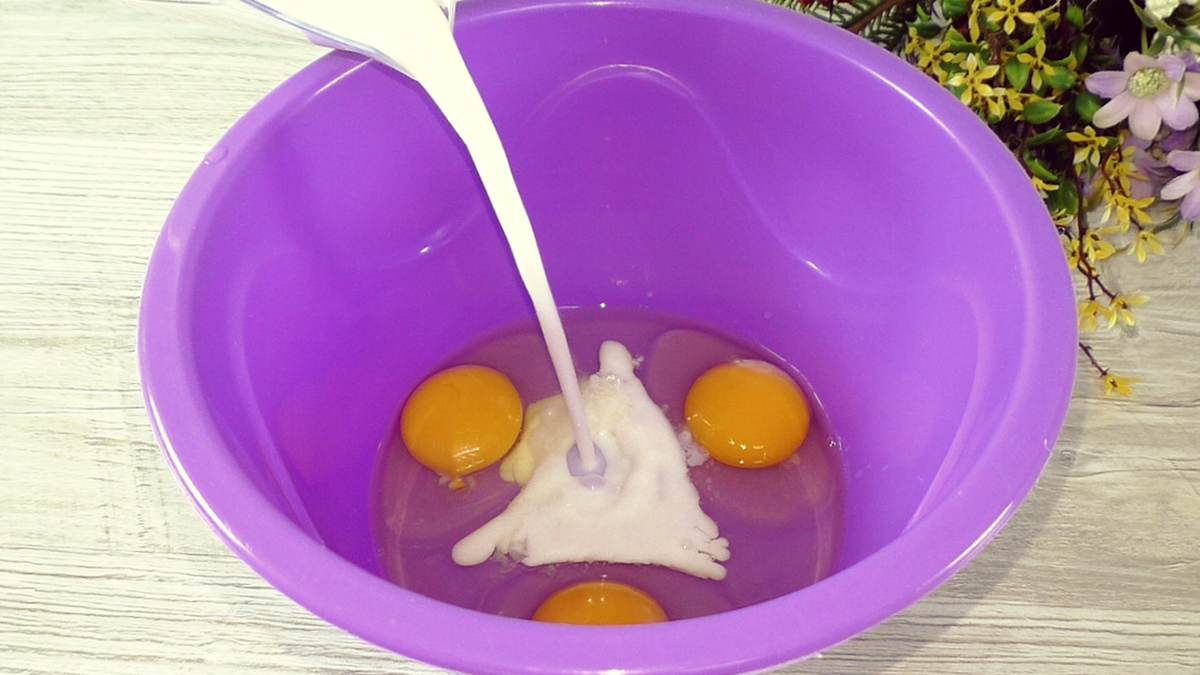 Для начала в глубокой миске следует взбить яйца с сахаром и солью. В этом случае лучше использовать 0.5 ч. л. соли, но можно скорректировать по вкусу, учитывая солёность сыров и колбасы. После этого в смесь добавляется молоко и всё тщательно перемешивается, пишет Дзен-канал "Красилова Наталья / Food".
