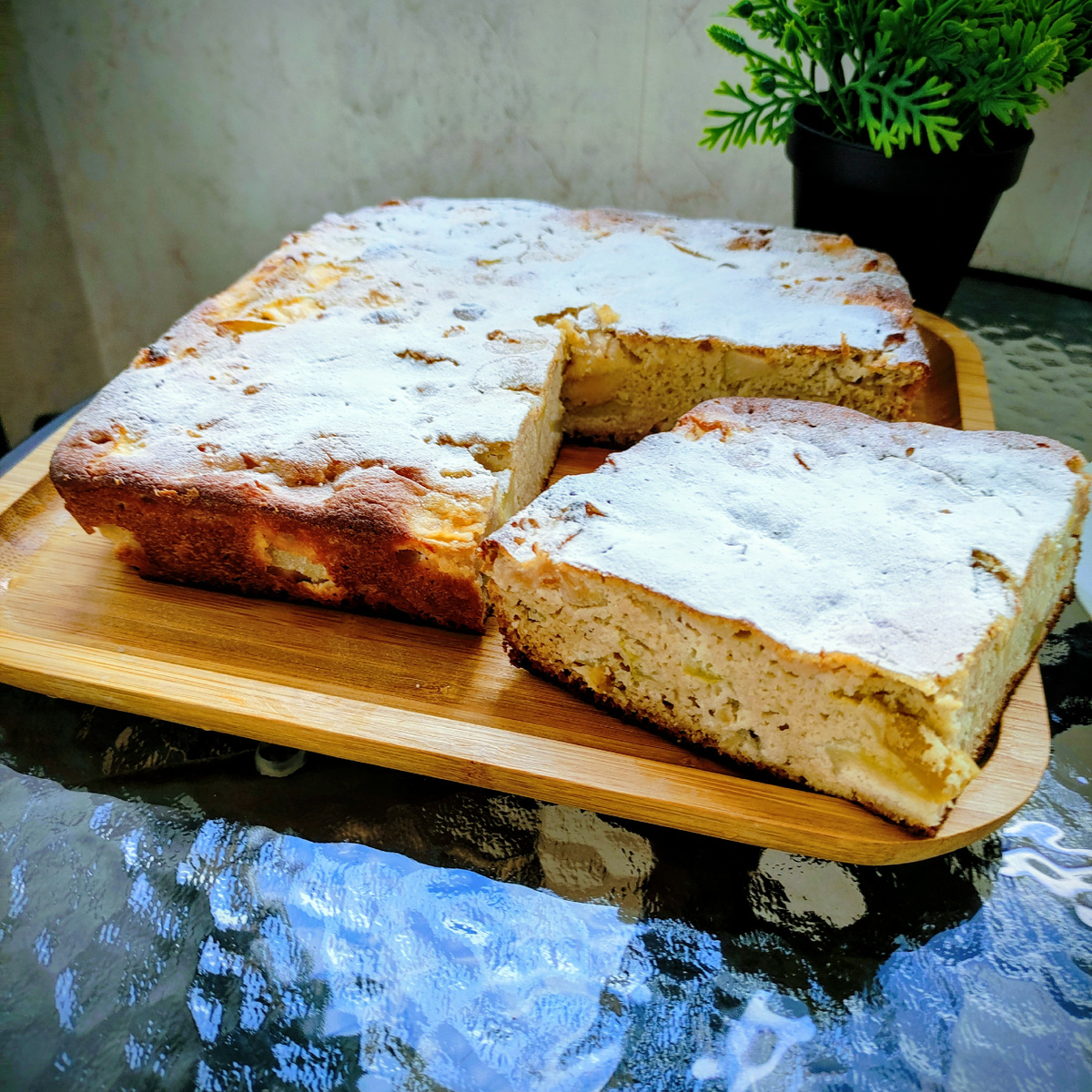 Важно помнить, что готовность проверяется шпажкой: она должна выйти сухой. По желанию, шарлотку можно посыпать пудрой из эритрита, чтобы добавить небольшой сладкий акцент.