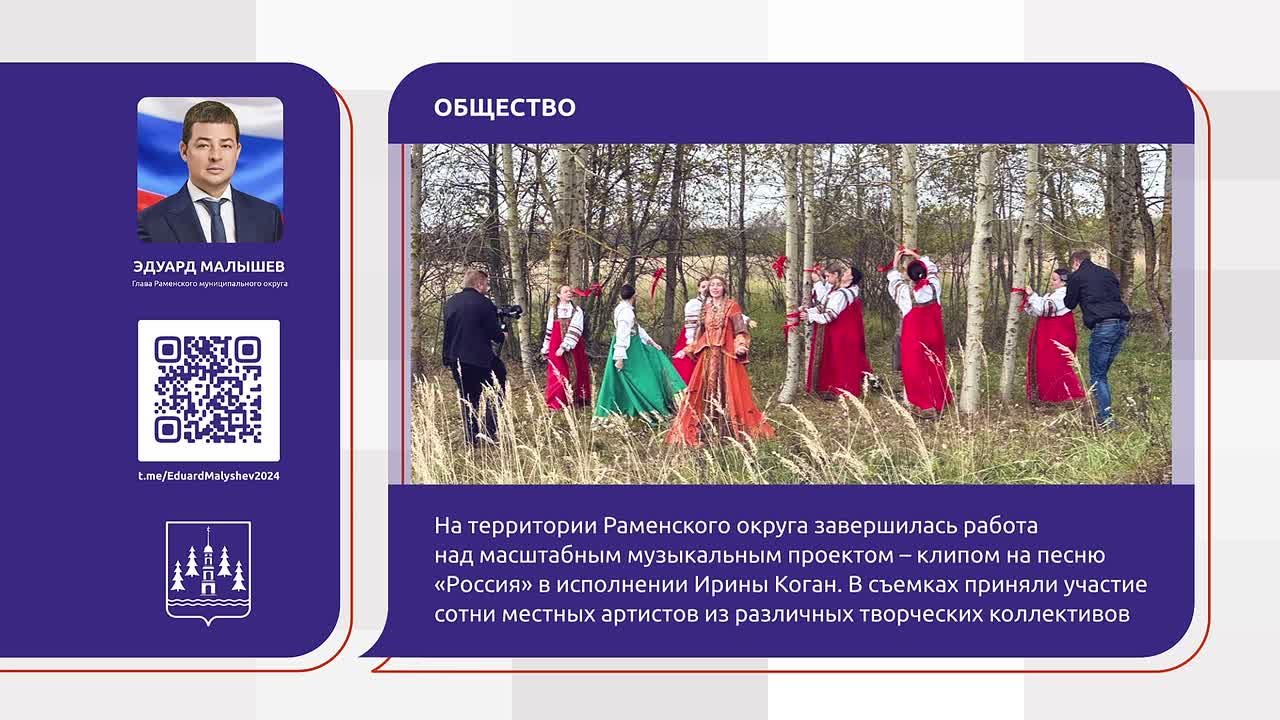 На территории Раменского округа завершилась работа над масштабным музыкальным проектом – клипом на песню «Россия» в исполнении Ирины Коган. В съемках приняли участие сотни местных артистов из различных творческих коллективов