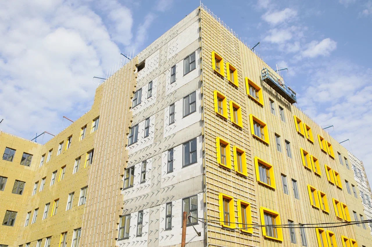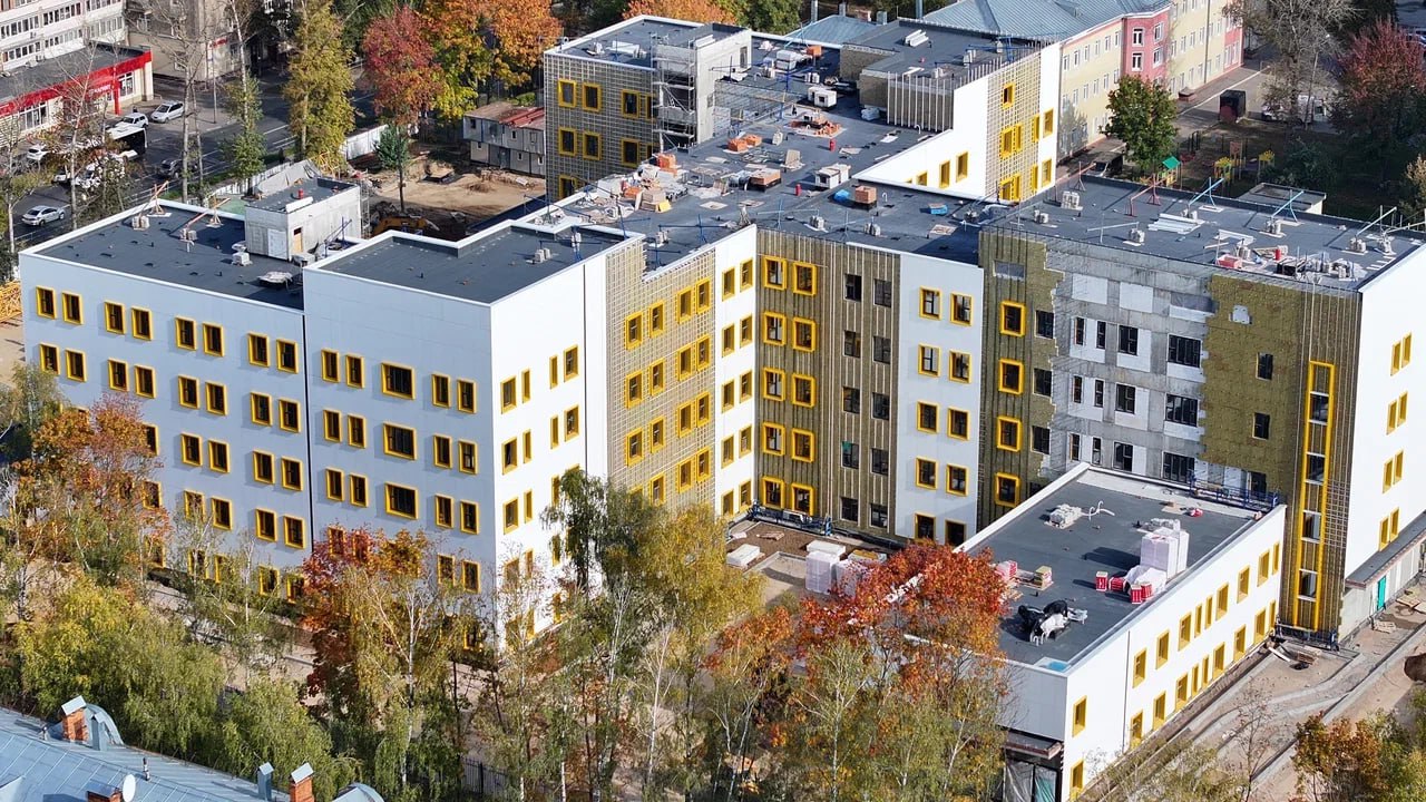 Сегодня на объекте уже завершены все монолитные работы, возведены наружные стены, фасад почти готов, внутри активно ведутся отделочные работы, монтаж инженерных систем, установка витражных окон и благоустройство территории.