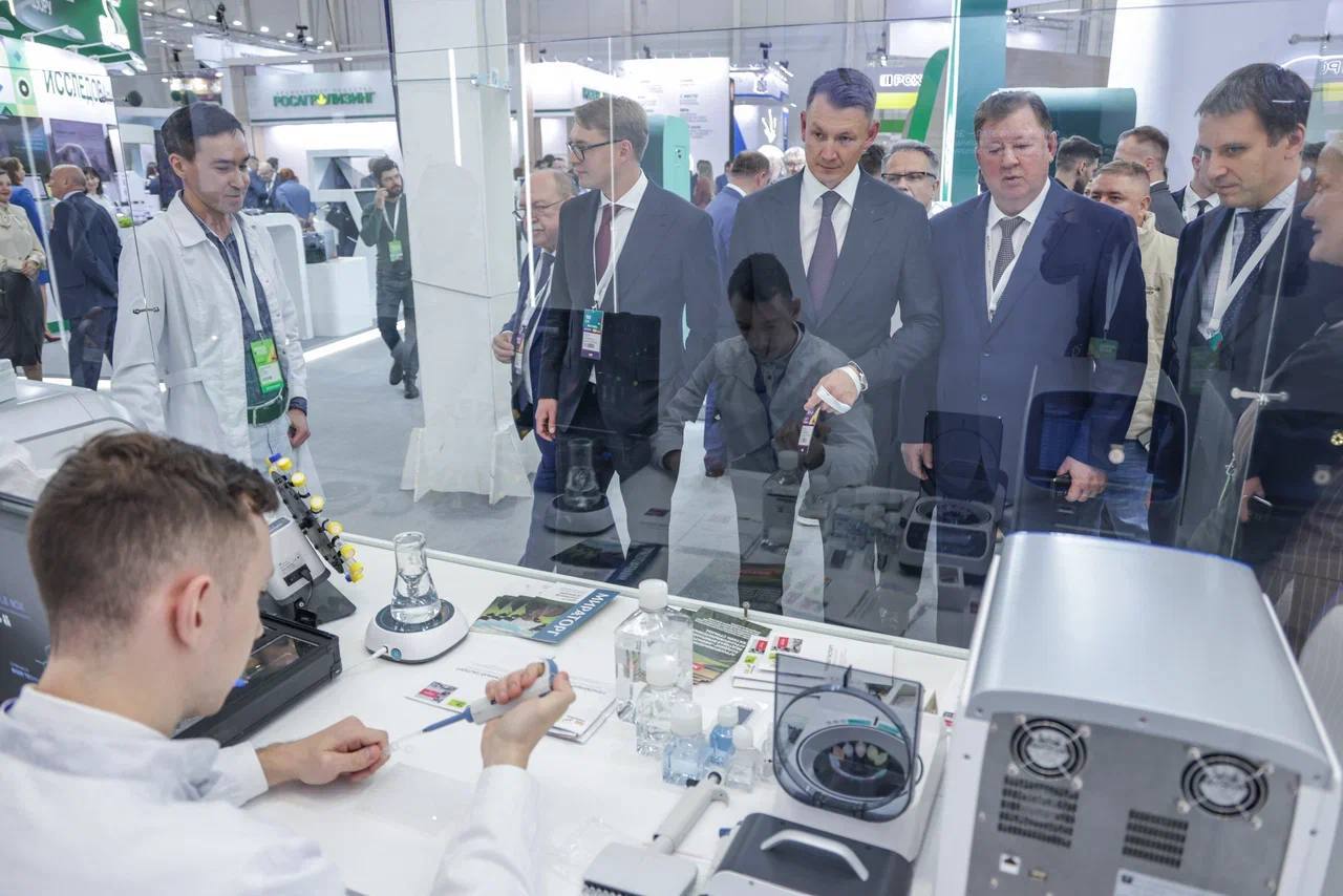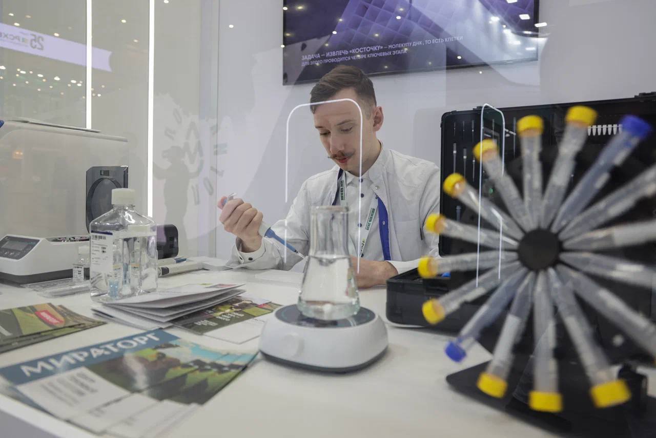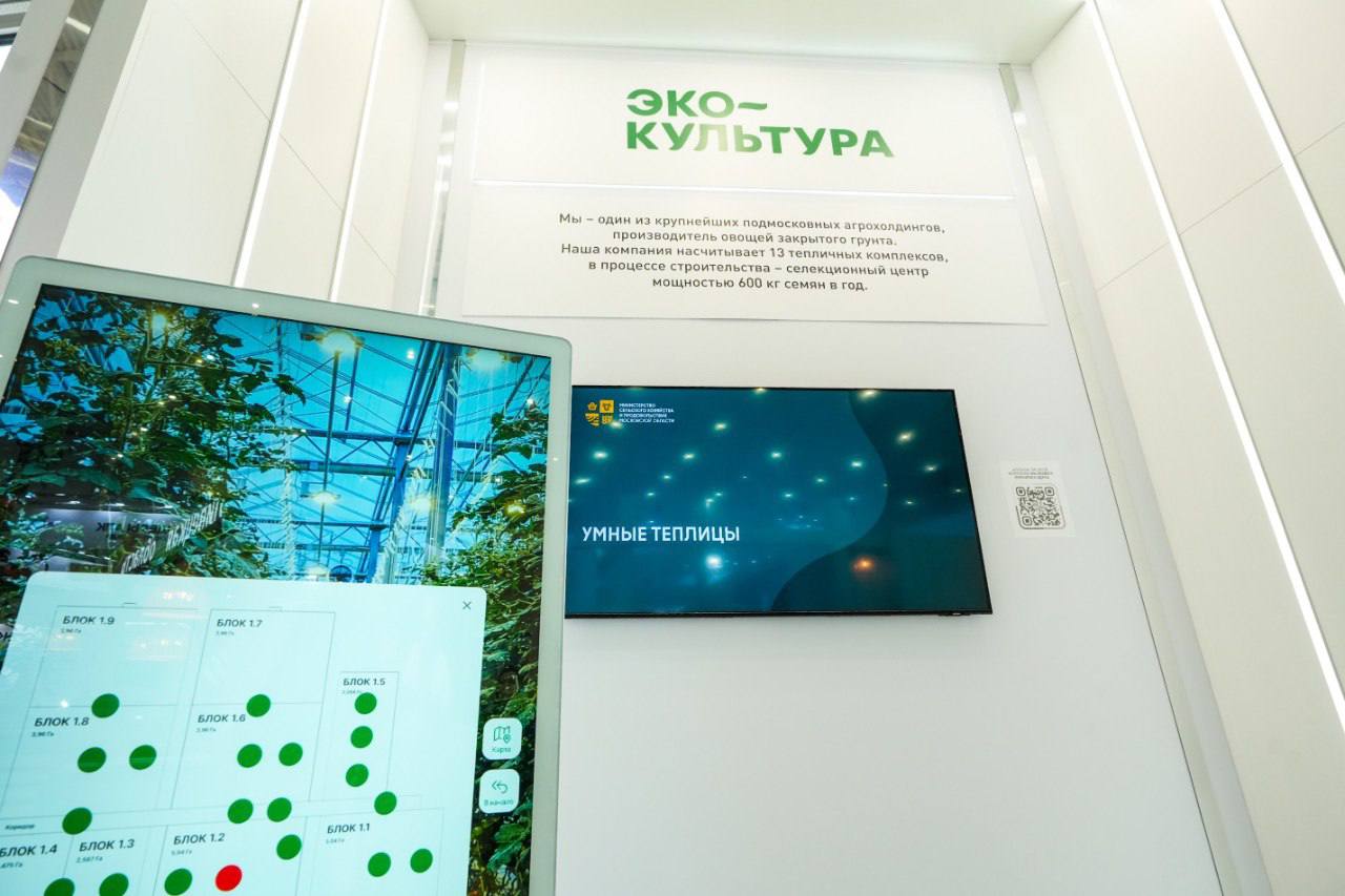 РаботалаинтерактивнаяSNP-лаборатория,где в реальном времени показывали анализ ДНК, подбирая лучшие гены для будущего поголовья. Слева от лаборатории – 3D-тур по подмосковным теплицам и цифровая платформа «Эковижн» – для управления тепличным производством от планирования до аналитики.