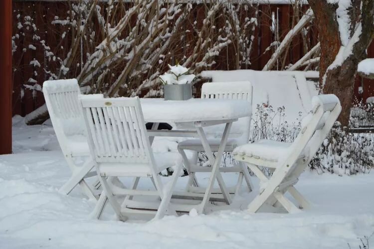 Первое, что стоит сделать, — это привести в порядок уличную мебель. Очистите столы и стулья от загрязнений, а в случае необходимости уберите их на хранение в сарай или гараж. Если место не позволяет, накройте мебель влагостойкими чехлами, чтобы защитить от влаги и снега.