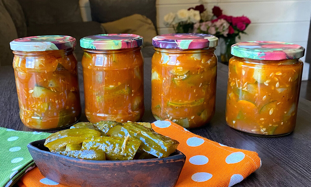 Закуска готова к хранению. Её можно держать в холодильнике или при комнатной температуре. Из указанных ингредиентов получится примерно четыре банки по 500 мл. С этой закуской ваши праздничные столы или обеды будут особенными, ведь она обладает лёгкой остринкой и великолепным вкусом!