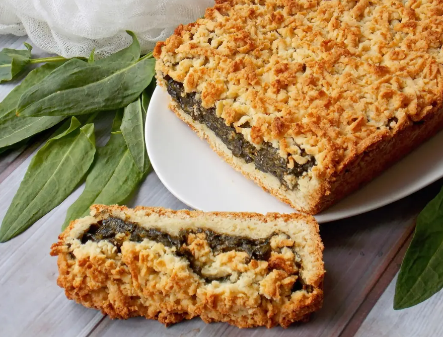 После охлаждения корж извлекается из холодильника и на него равномерно выкладывается начинка из щавеля. Вторую часть замороженного теста натирают на терке и аккуратно распределяют сверху на начинку. Пирог отправляется в духовку, разогретую до 180 градусов, где выпекается в течение 20-25 минут до золотистой корочки.