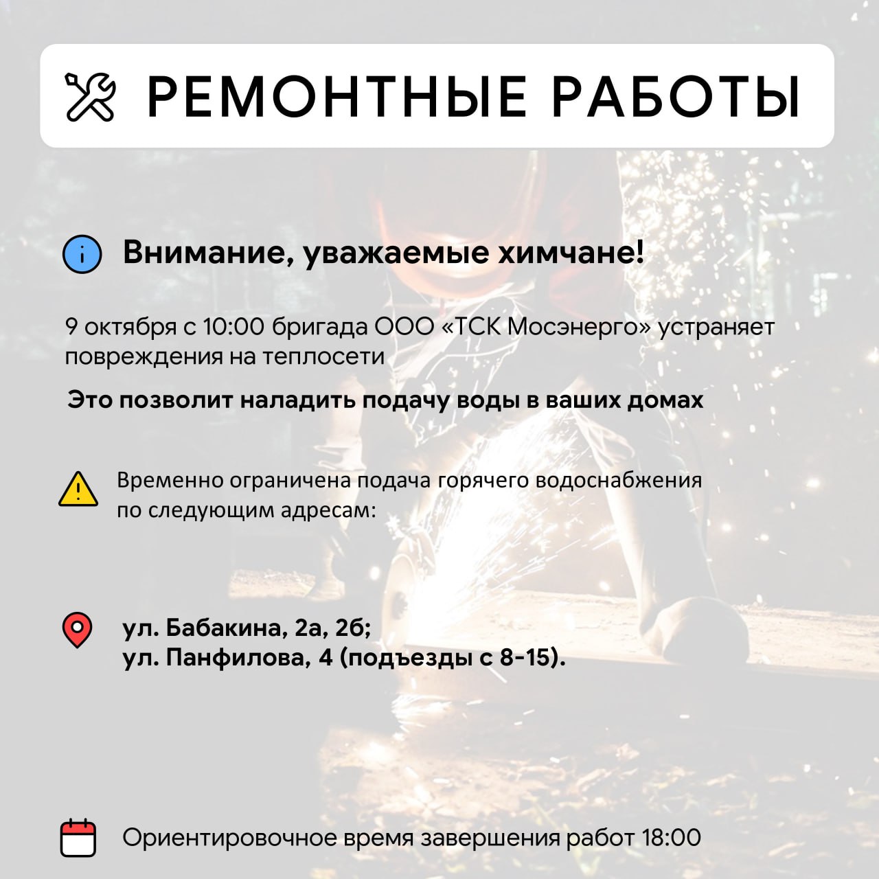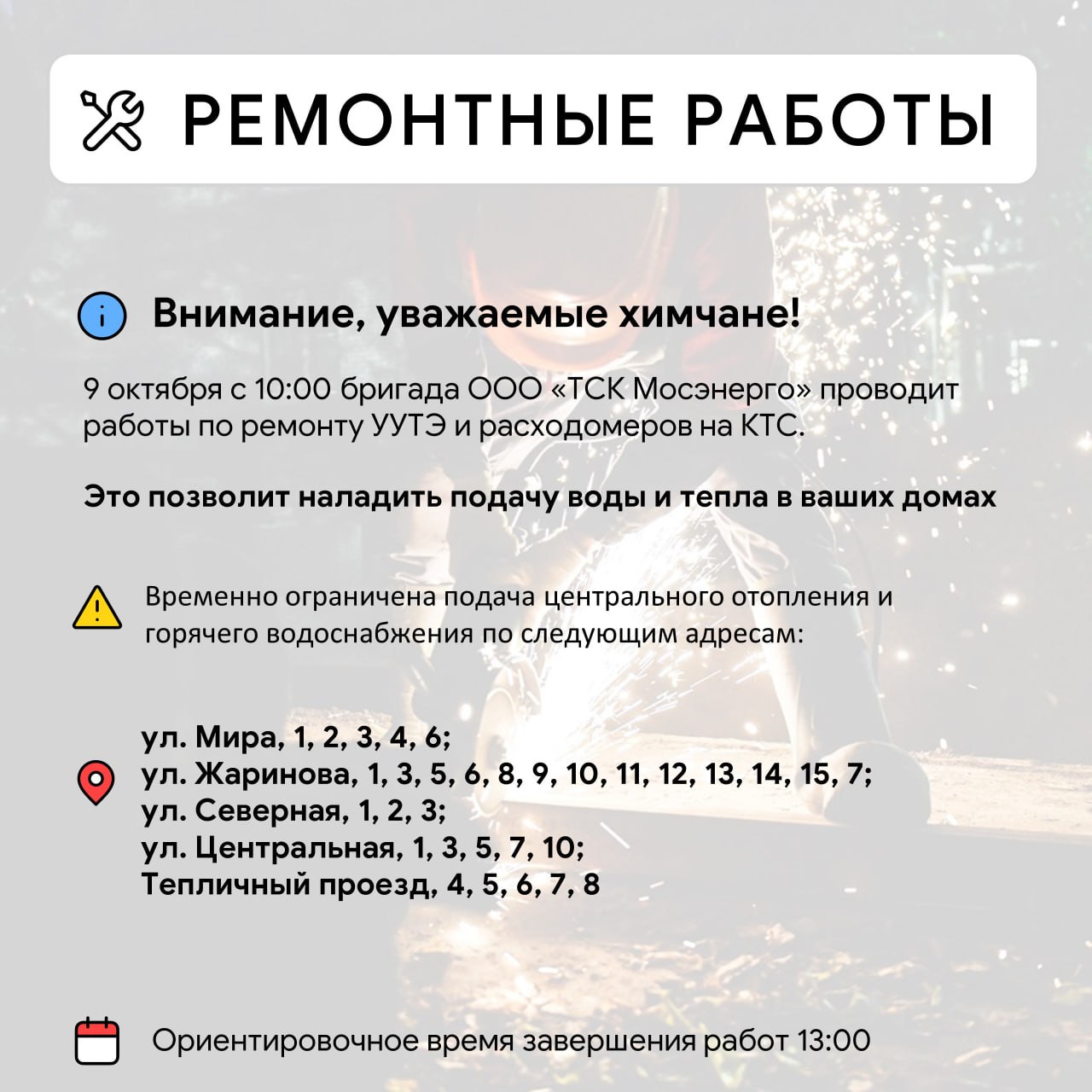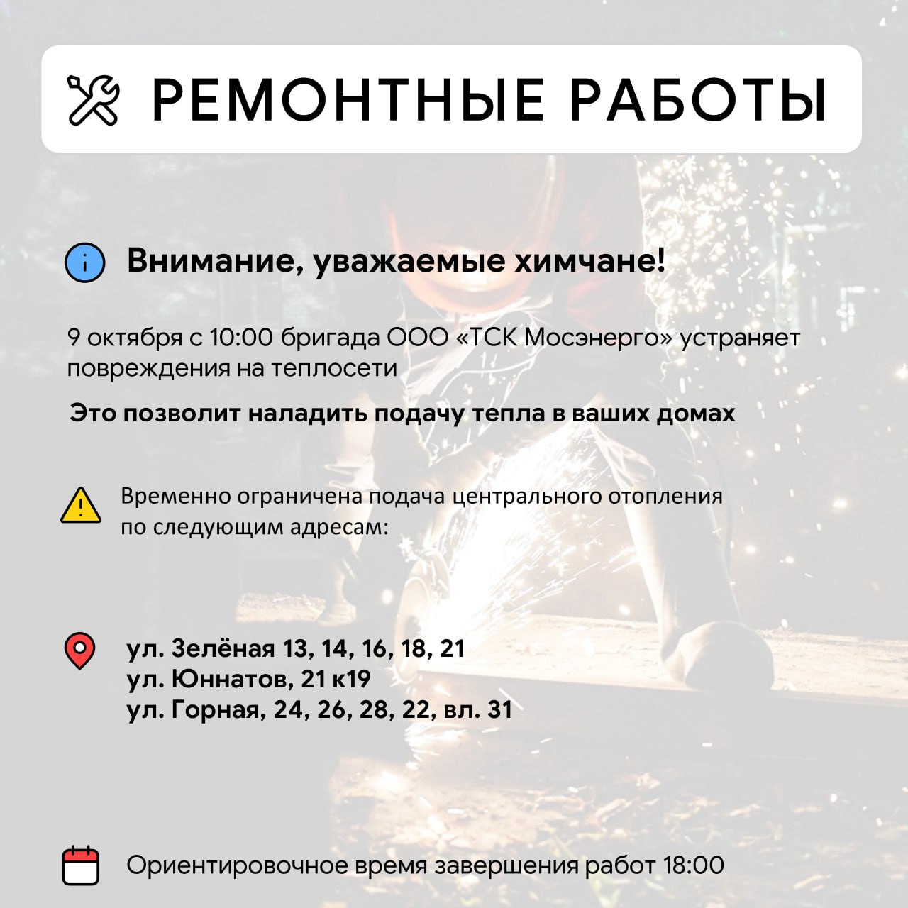 Уважаемые красногорцыПроводятся работы по восстановлению сетей электроснабжения в п. Нахабино, по ул. Красноармейская, 4, 5 а,33,35,37,39, 47,49,52,51,54,53, 58,59,60,61, ул.Советская, 28.Телефоны ЕДДС:+7 498 6985011;+7 498 6985006.Приносим извинения...