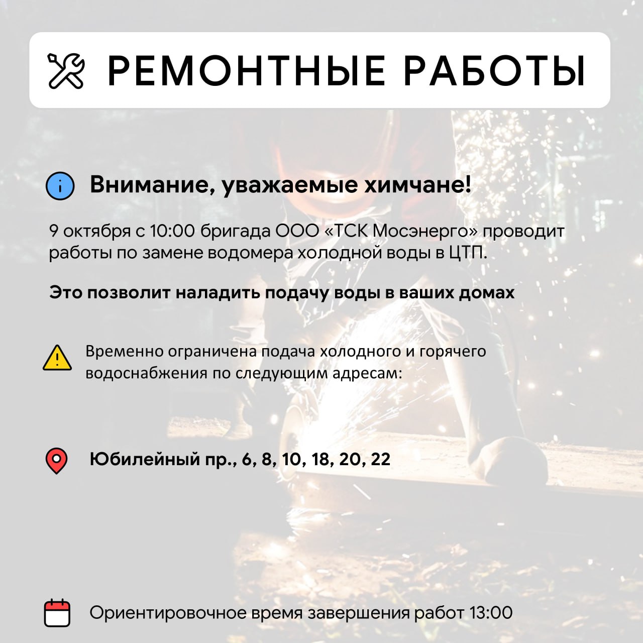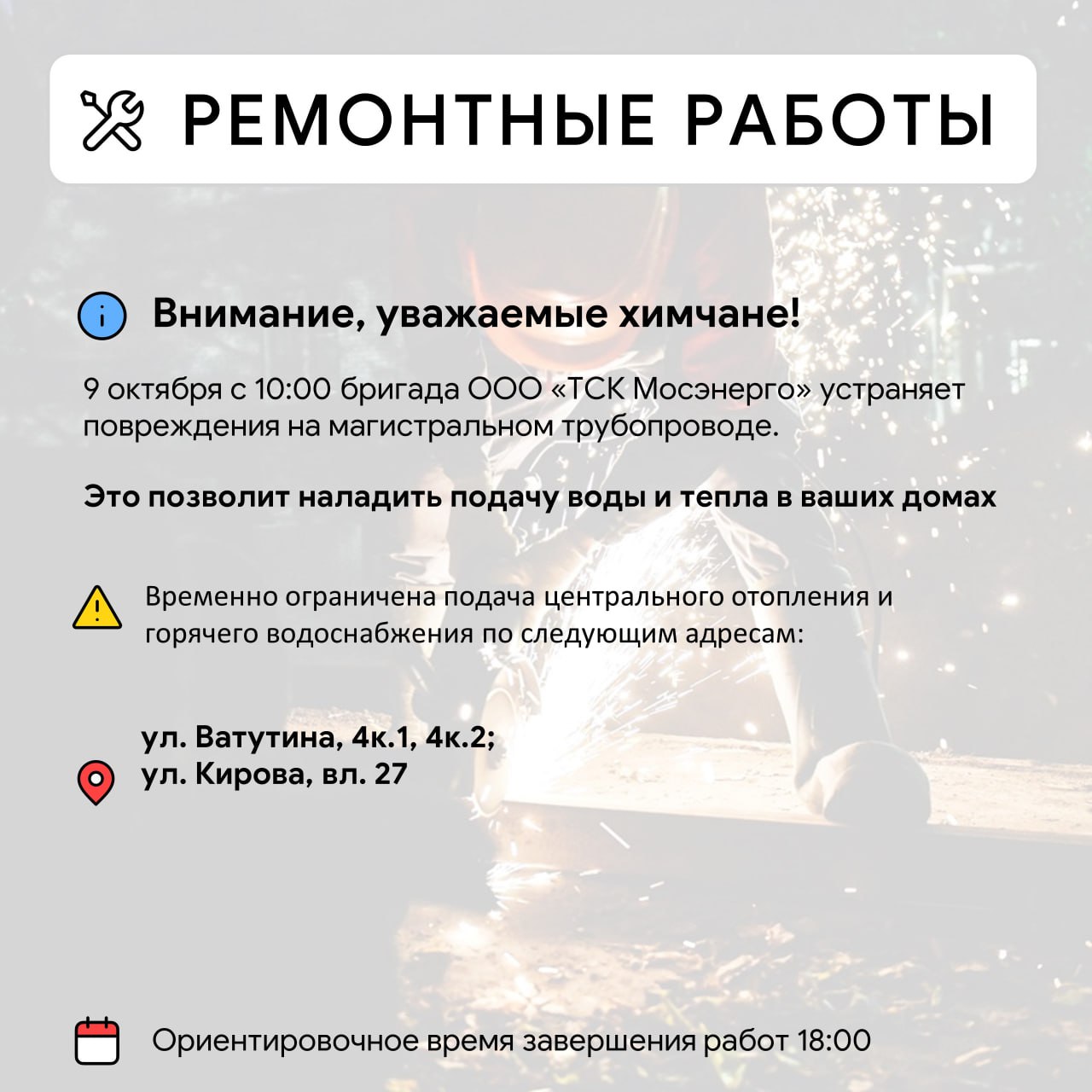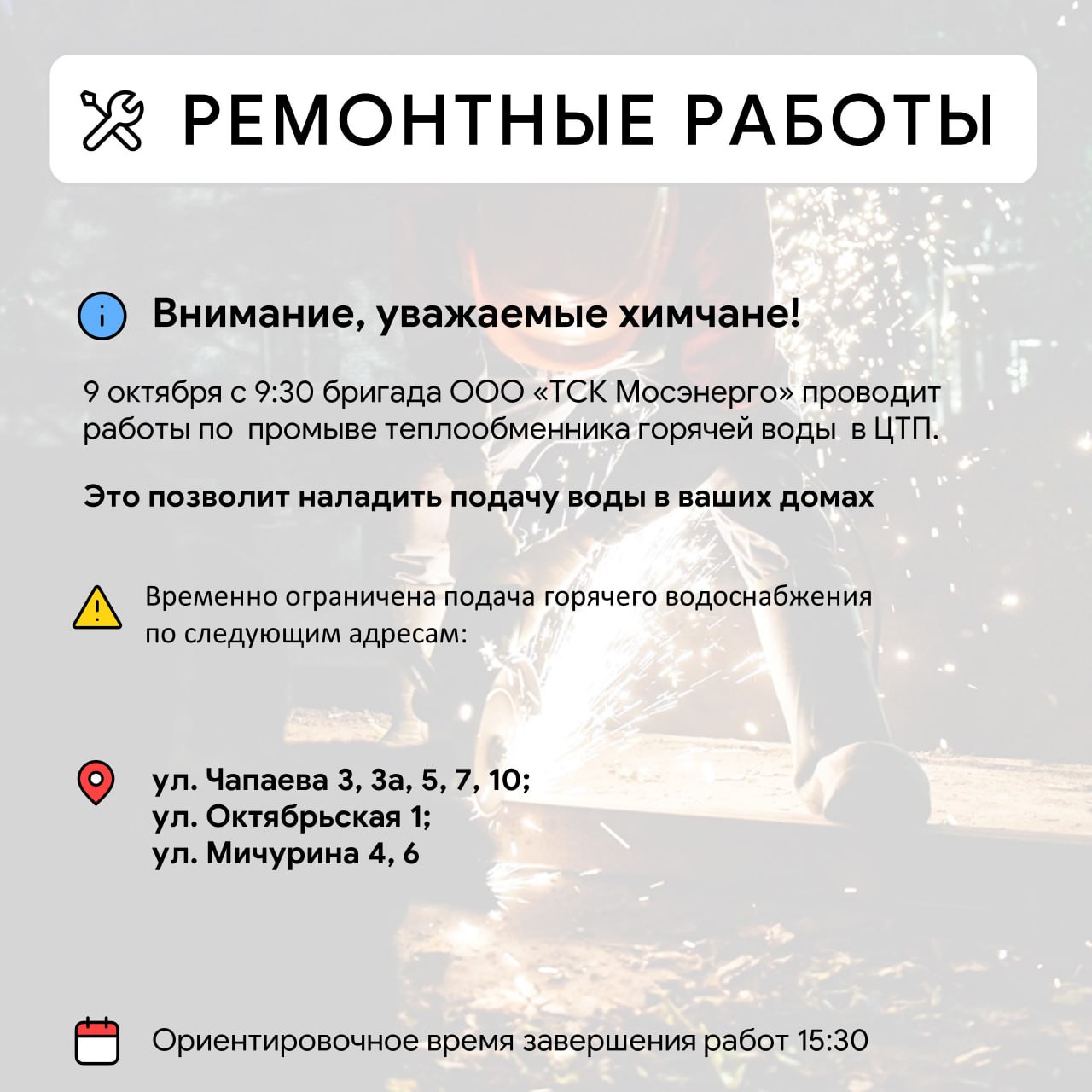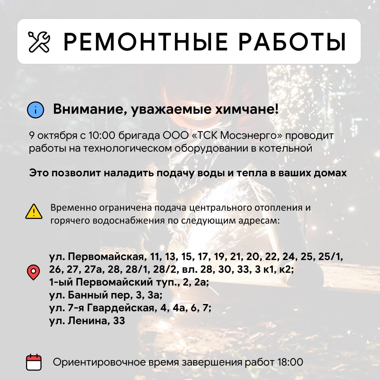 Уважаемые красногорцыПроводятся работы по восстановлению сетей электроснабжения в п. Нахабино, по ул. Красноармейская, 4, 5 а,33,35,37,39, 47,49,52,51,54,53, 58,59,60,61, ул.Советская, 28.Телефоны ЕДДС:+7 498 6985011;+7 498 6985006.Приносим извинения...
