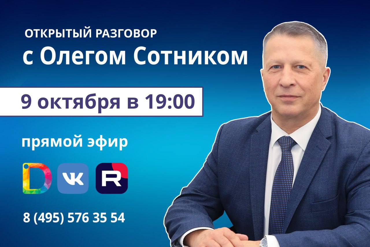 Сегодня, 9 октября, в 19:00, на телеканале «Долгопрудный» состоится прямой эфир программы «Открытый разговор» с главой городского округа Долгопрудный Олегом Сотником.