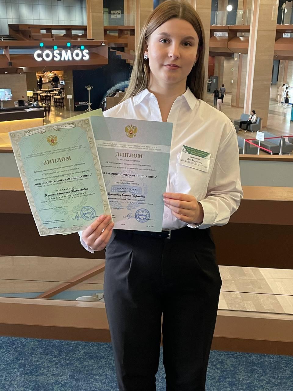 Яна Калинина из колледжа «Подмосковье» заняла 1 место на Всероссийском конкурсе «Моя законотворческая инициатива».
