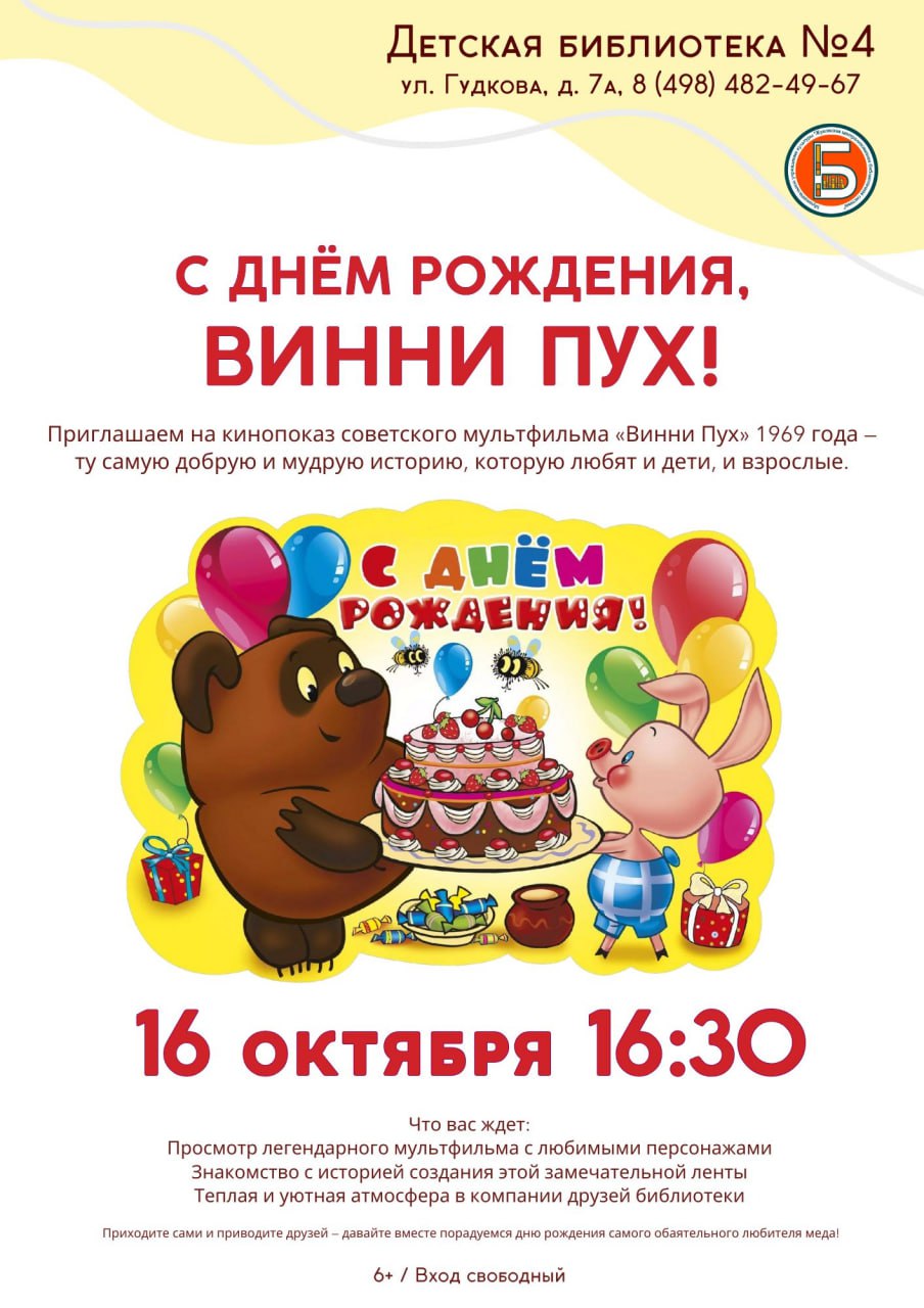 Жуковская детская библиотека №4 приглашает юных читателей и их родителей на праздничное мероприятие, посвященное дню рождения одного из самых любимых сказочных персонажей — медвежонка Винни-Пуха. Мероприятие состоится 16 октября в 16:30 по адресу: ул. Гудкова, д. 7а.