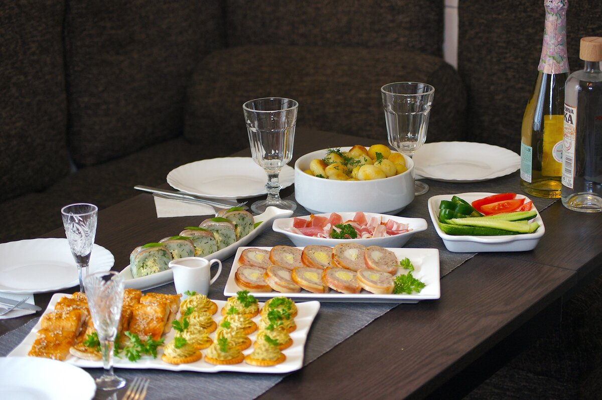 При организации стола важно продумать количество закусок. Для небольшой компании из четырех человек хватит нескольких незамысловатых, но аппетитных блюд. Например: