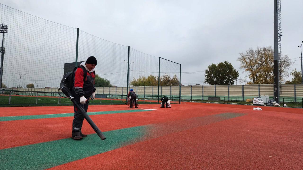 На стадионе «Авангард» в Домодедово наносят разметку на беговые дорожки.