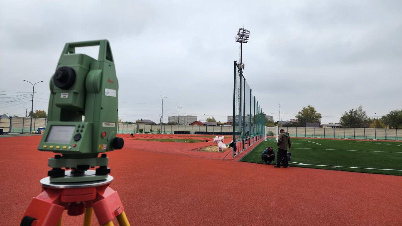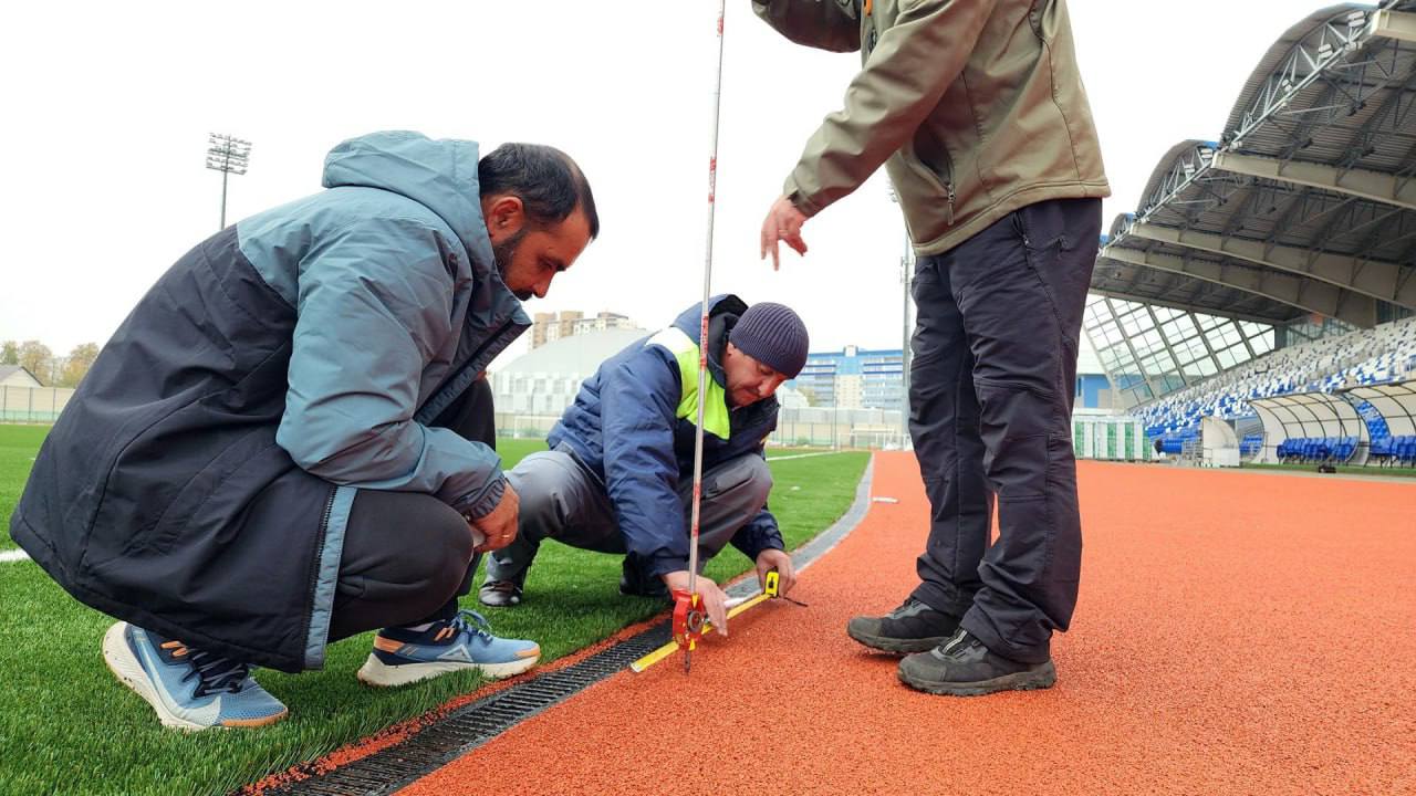 Для точного нанесения разметки специалисты используют тахеометр. Каждые 40 сантиметров бригада наносит маркерные точки, которые помогут с высокой точностью разметить ширину будущих дорожек. Затем рабочие наносят разметку с помощью специальной машины. На стадионе будет восемь дорожек для разных дистанций от 100 до 5000 метров.