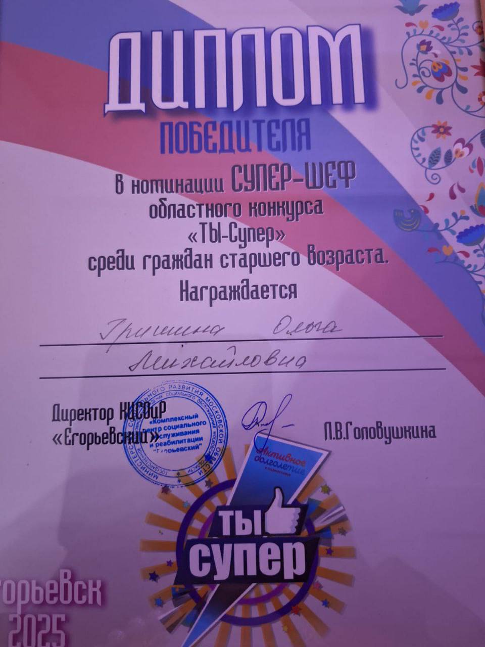 г.Чехов. Сегодня в Егорьевске прошёл финал Областного конкурса « Ты - супер 2025» для участников программы « Активное долголетие в Подмосковье». Тема конкурса в этом году: «Россия -моё вдохновение». Участники использовали в своих работах элементы и стилистику русской национальной культуры. «Долголеты» из г. Чехова приняли участие в номинациях: « Супер - мастер» и « Супер - шеф» и победили в номинации « Супер-шеф». Участие в конкурсе - это уникальная возможность заявить о себе, продемонстрировать свои таланты, а значит ещё больше людей серебряного возраста смогут сказать : « Я - СУПЕР! »