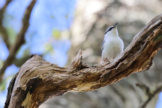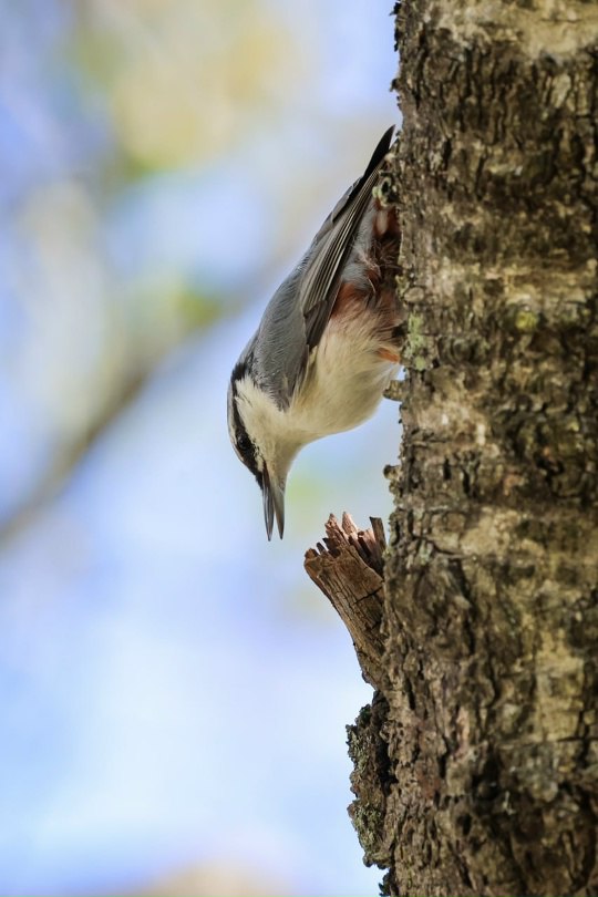 Знакомьтесь, этот красавец — поползень! Изящный, ловкий и очень запасливый. Он зимует в Мелихове и, чтобы пережить холода, ему нужны припасы, поэтому он прячет семена, орехи и насекомых в щелях коры деревьев и других укромных местах.