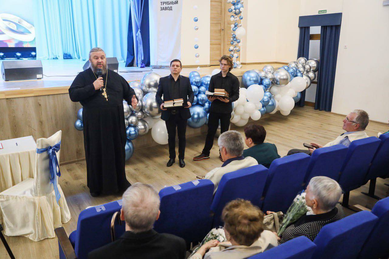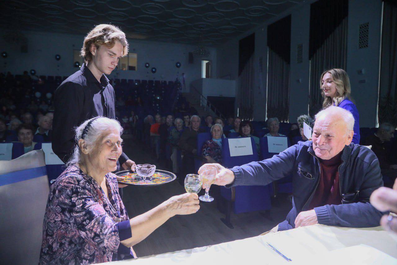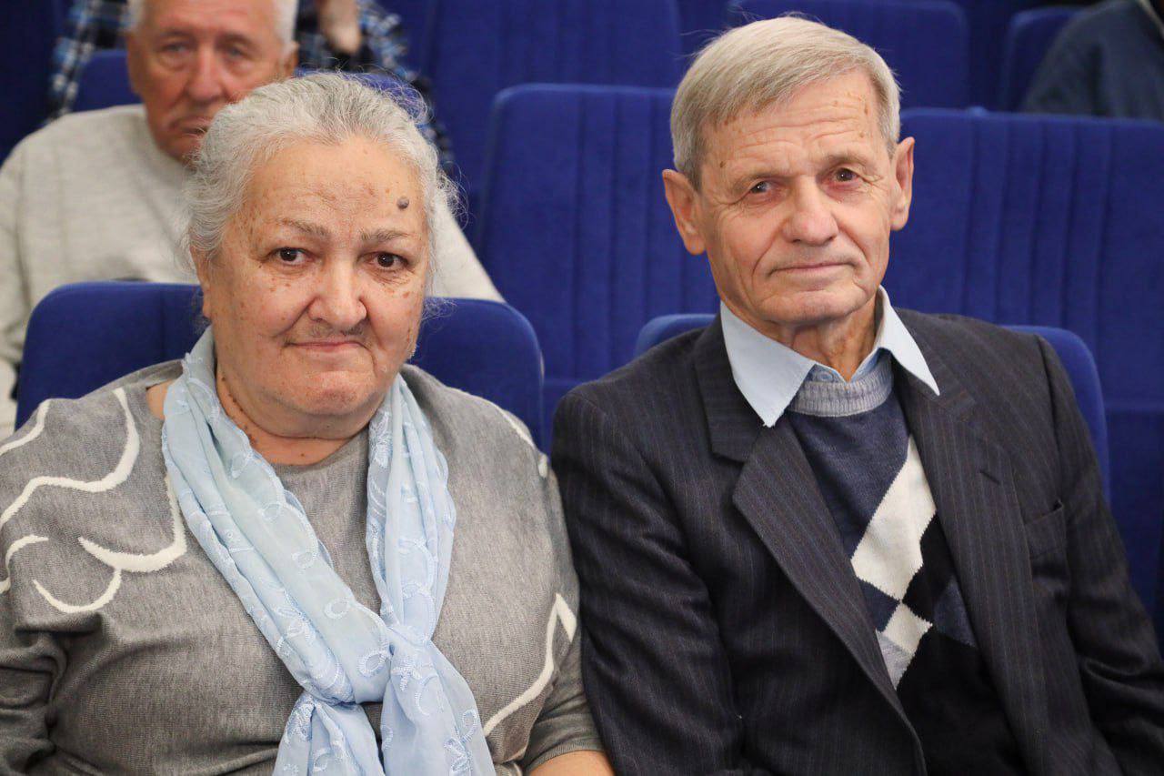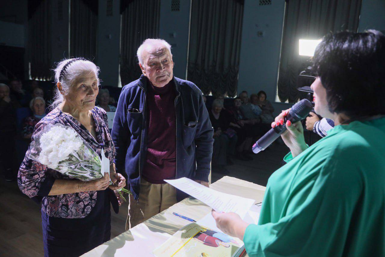 В зале — улыбки, цветы и музыка, выступления юных артистов ДК, истории юбиляров — как познакомились, где работали, сколько детей и внуков вырастили. Каждую пару встречали аплодисментами.